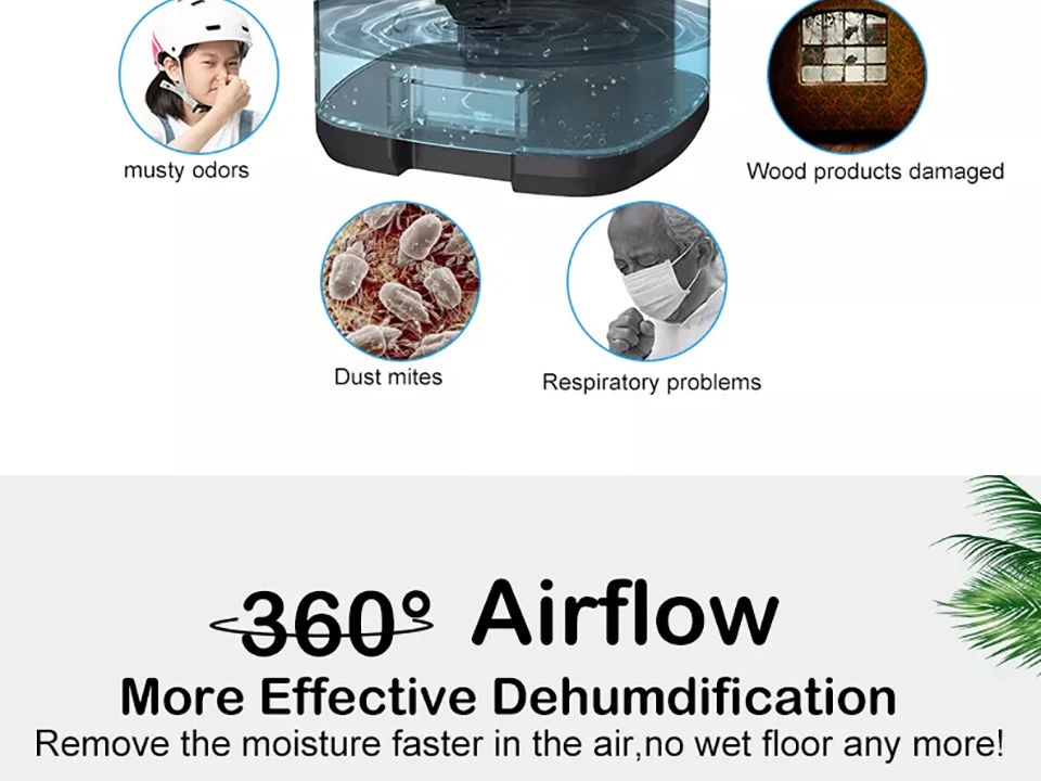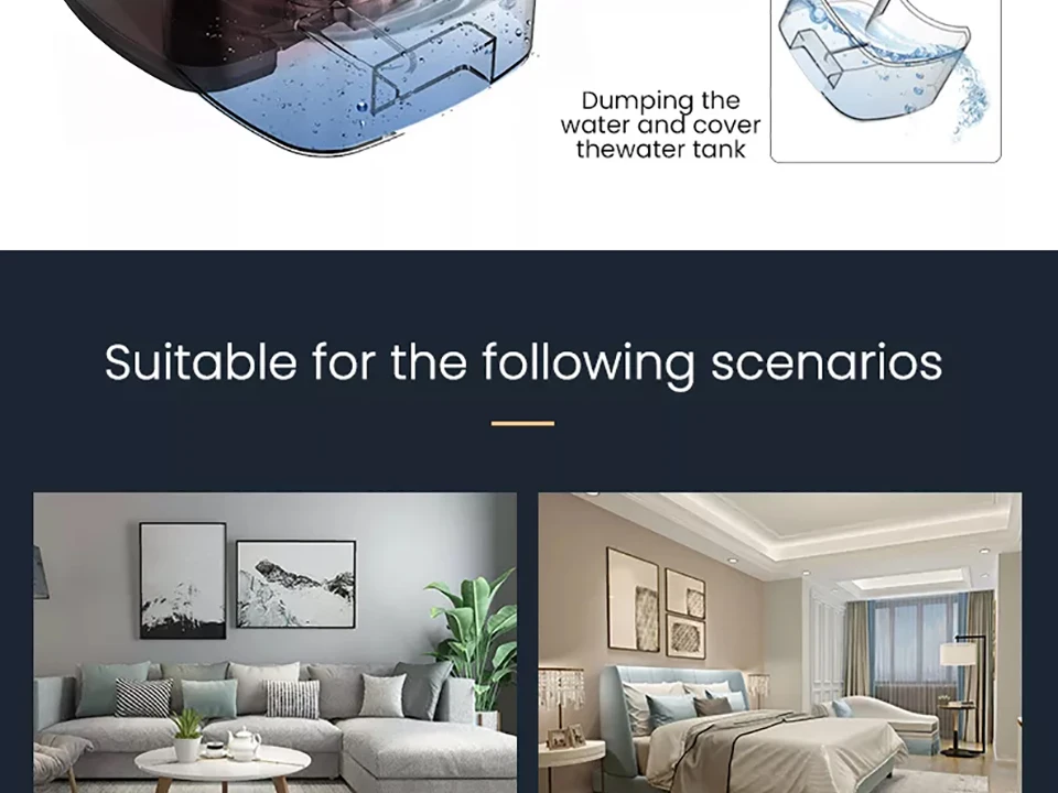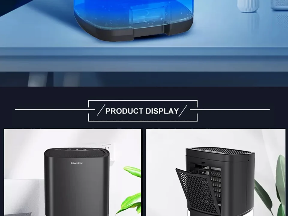 제습기는 용량에 도달하면 자동으로 차단됩니다. 최대 300ml/day의 수분을 흡수하고 탈착식 트레이로 1000ml 물 탱크 용량을 흡수합니다.