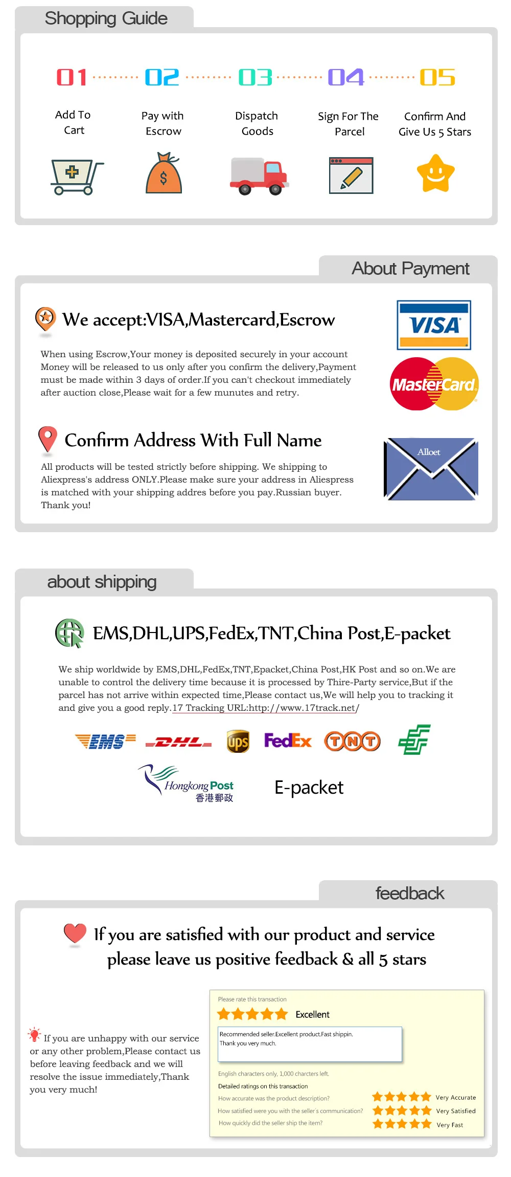 1. 제품 및 서비스에 만족하시면 긍정적 인 피드백과 별 5 개를 남겨주세요.