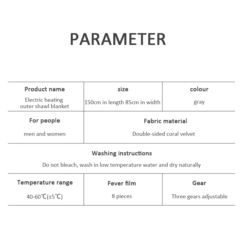 2 、 광범위한 사용 범위: 이 가열 숄은 모든 USB 포트에 삽입 할 수있어 매우 편리합니다. 가열 된 담요의 길이, 너비 및 두께는 약 150*85cm 59x33.5x0.6 인치입니다.