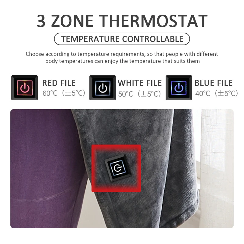 3 、 빠른 가열: 가열 담요는 3 개의 가열 설정 40 ℃-60 ℃ (95 °F-140 °F), 버튼 하나만 있습니다. 빠른 난방 기능으로 추운 날씨를 견딜 수 있고 짧은 시간에 편안한 느낌을 얻을 수 있습니다.