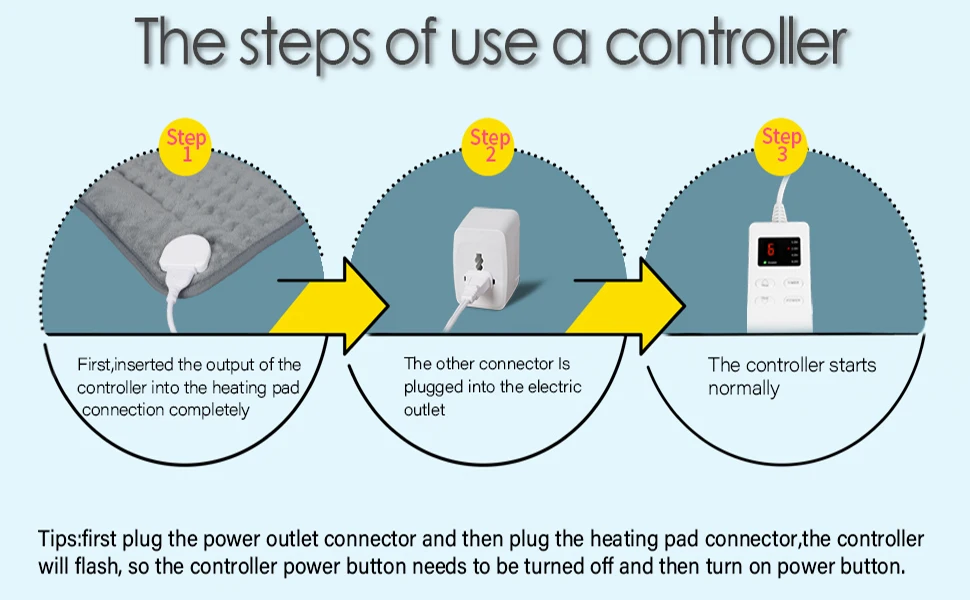 가열 패드가 전원 공급 장치에 단단히 삽입되지 않으면 컨트롤러가 계속 깜박입니다. 일정 시간 동안 작동 한 후 가열 패드가 자동으로 종료되면 과열 방지 기능이 켜집니다. 전원 공급 장치를 켜려면 전원 버튼을 다시 누르십시오.