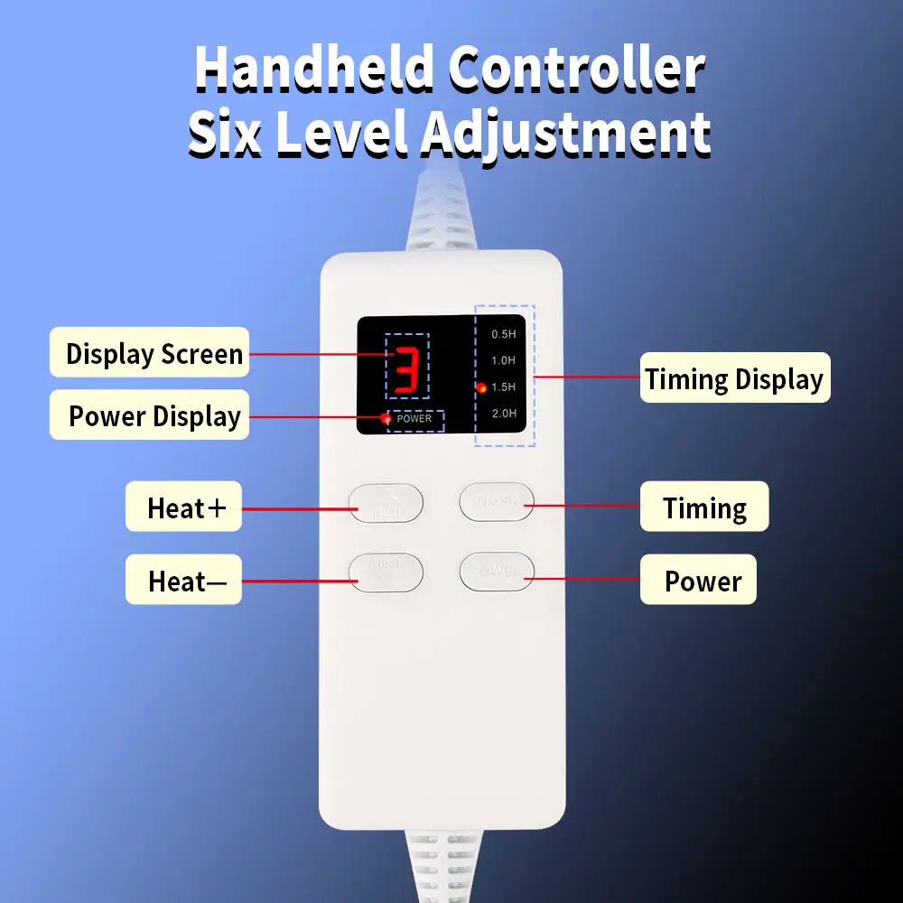 건강하고 빠른: LCD 컨트롤러는 편리하며 6 가지 가열 옵션 (80 °F ~ 140 °F) 과 4 개의 타이머 (30 분 또는 2 시간) 를 제공합니다. 내장 된 NTC 패킹 레이어 및 PTC 합금 와이어, 온도 조절 가능 및 자동 소화 장치는 과열 및 연소를보다 효과적으로 피할 수 있습니다. 75W 전력은 30 초 안에 빠르게 가열 할 수 있습니다.