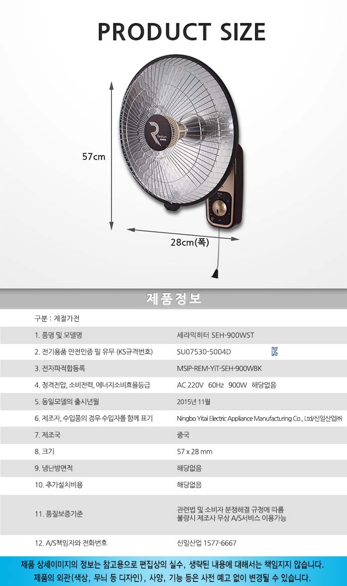 품명 및 모델명 : 세라믹코일 전기히터 벽걸이형 전기난로 SEH-900WST