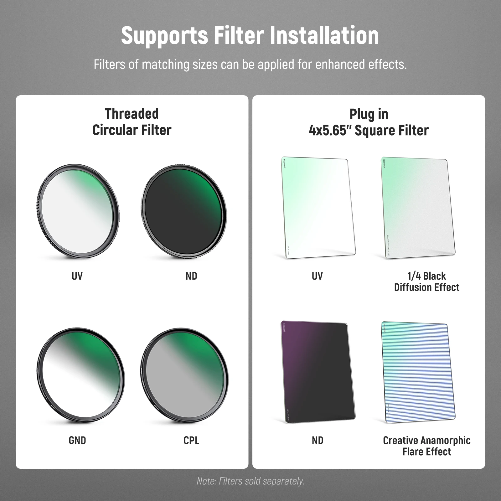 【 4 "x 5.65" 표준 필터 트레이】포함 된 하나의 필터 트레이는 4 "x 5.65" 직사각형 필터 (포함되지 않음) 에 맞습니다. 필터 (별도 판매) 는 필터 트레이 나사 손잡이로 고정하고 고무 패드로 보호 할 수 있습니다. K & F와 호환 가능 NISI와 호환 TIFFEN 호환 Tilta와 호환 가능 SmallRig 사각 필터 촬영 용