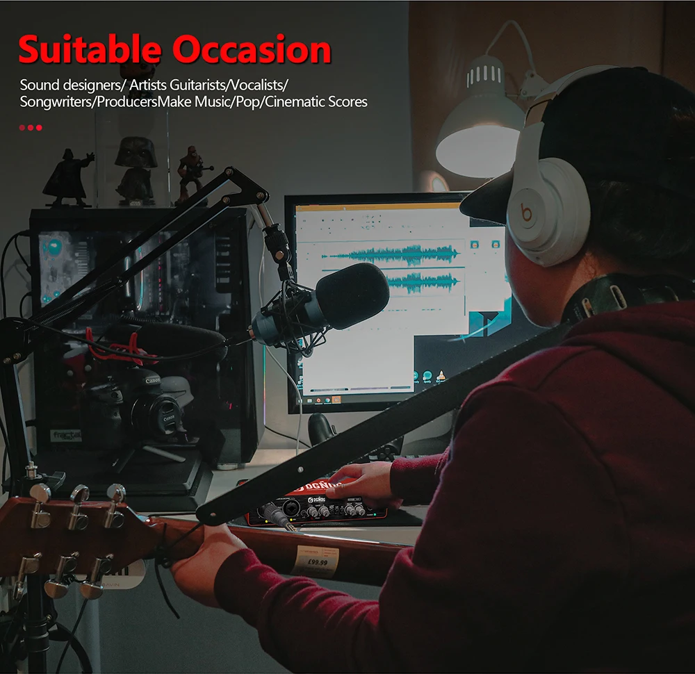 【드라이버 무료 설치 및 광범위한 호환성】사운드 카드는 PC와 연결하여 플러그 앤 플레이를 지원할 수 있으므로 드라이버를 설치할 필요가 없습니다. Reaper, Audacity, GarageBand, Cubase, Ableton Live 등과 같은 대부분의 레코딩 소프트웨어와 호환됩니다. UC22 사운드 카드는 녹음, 편집 및 믹싱에 새로운 자유를 제공합니다. 녹음 한 모든 오디오는 스튜디오 품질입니다. 즉 나중에 다시 녹음하기 위해 스튜디오에 갈 필요가 없습니다.