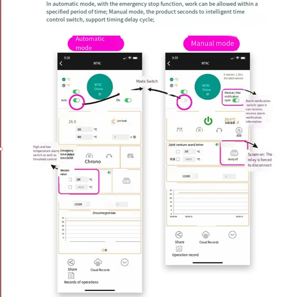 모바일 APP 제어 인터페이스: 자동 모드에서 긴급 정지 기능, 지정된 시간 내에 작업을 허용 할 수 있습니다. 수동 모드에서 제품은 몇 초 만에 지능형 시간 제어 스위치로 바뀌어 타이밍, 지연 및주기를 지원합니다.