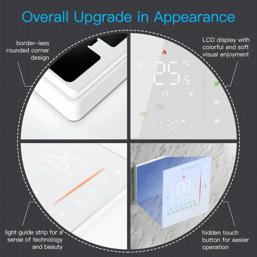 1. 기능성 난방 시스템: 지능형 수위, 전기 난방 및 수도 가스 보일러 난방 시스템에 포함 된 Tuya Wi-Fi 프로토콜로 제어하여 집 온도에 대한 스마트 생활에 최대한의 포괄적 인 편의성을 제공합니다. 온도 실내 및 습도를 쉽게 모니터링 할 수 있으며, 서모 스탯의 기상 관측소에서 자외선 실외, 가정을위한 단순하고 인간적이며 유쾌한 느낌을 만드는 데 중점을 둡니다. 이러한 종류의 색상은 다양한 장식 스타일에 적합합니다. (주: 현재 부하는 온수난방 및 가스 보일러용 5A, 전기 마루 난방용 16A 입니다.)