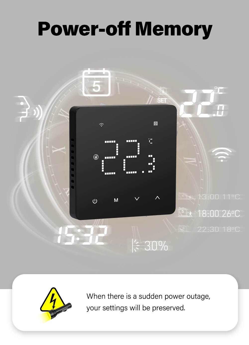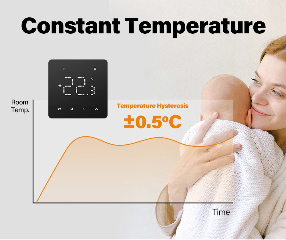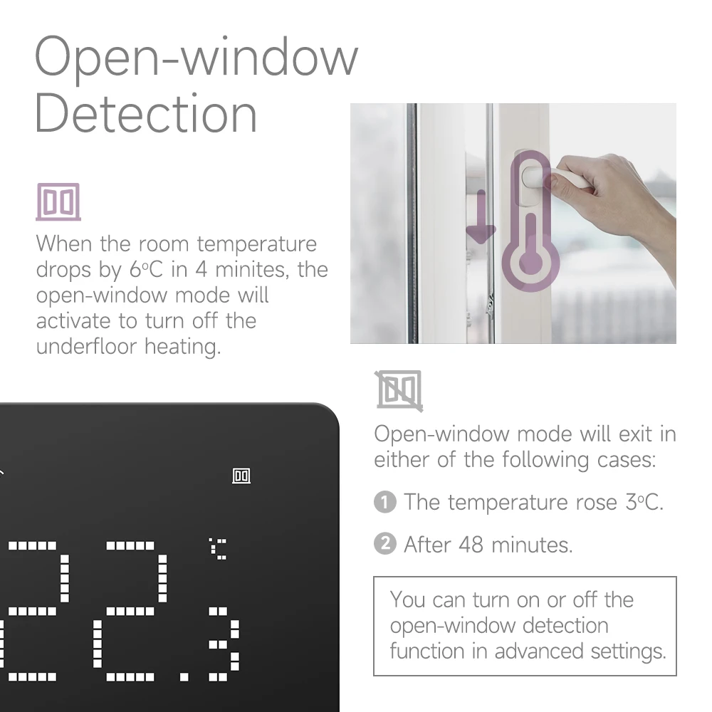 【창 열기 기능】 온도 컨트롤러가 실내 온도의 단기 감소를 감지하면 자동으로 난방을 중단하여 가정의 난방 비용을 절약합니다.