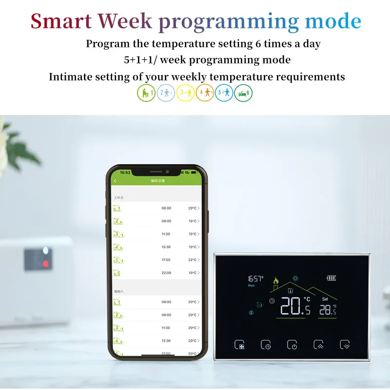 5, 프로그래밍 모드, 하루 6 시간 프로그래밍 가능 설정, 녹색 에너지 절약, 비용 절감, 보다 지능적인 환경 보호