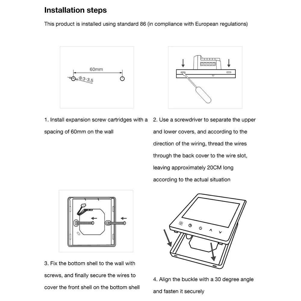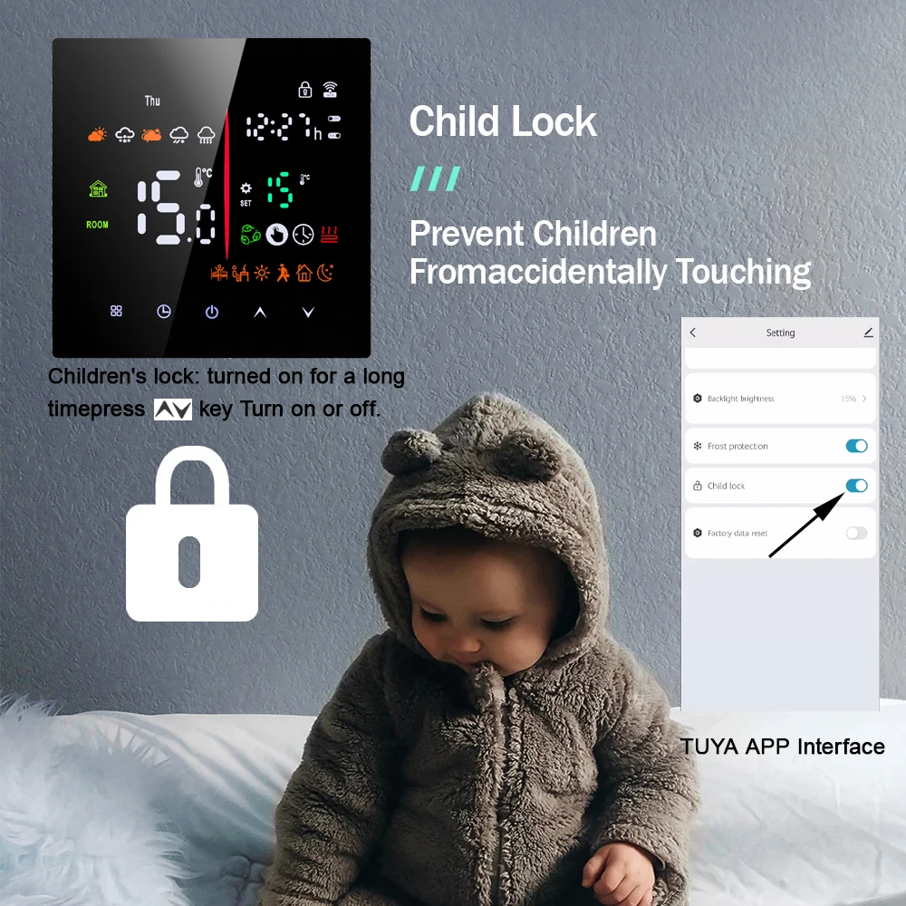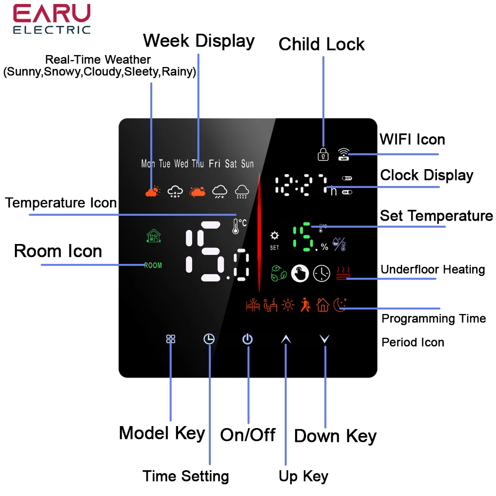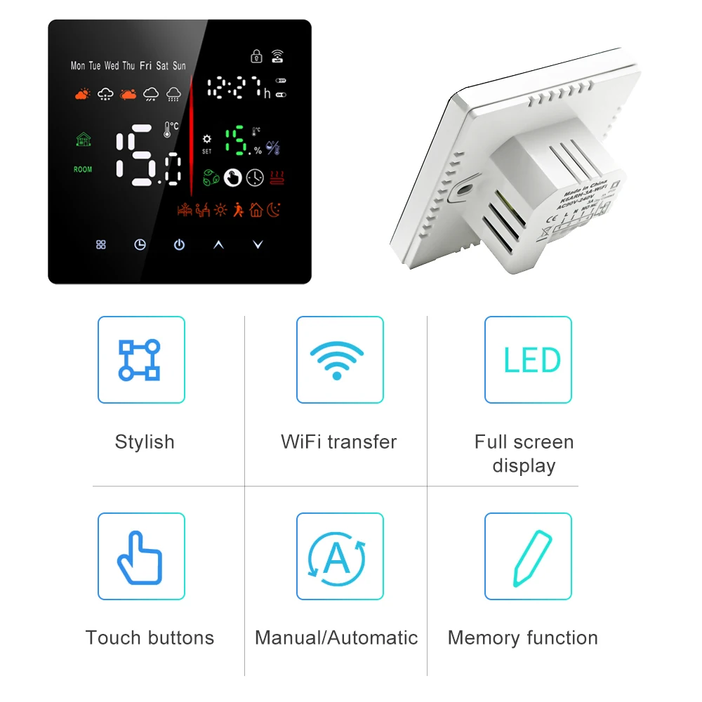 지능형 디지털 온도 조절기실내 온도 제어 및 가정용 온도 제어에 적합한 바닥 난방 시스템으로 주변 온도와 설정 온도의 비교를 감지하여 바닥 난방 장비의 작동 상태를 제어합니다. 에너지 절약 목표를 달성하면서 편안함을 향상시킵니다. 디지털 서모 스탯, 마이크로 컴퓨터 제어 기술을 채택하고 터치 버튼을 전체 화면으로 표시합니다. 디자인은 우아하고 관대하며 사용하기 쉽습니다. 온도 컨트롤러는 수동 및 자동 기능, 프로그래밍 가능한 기능, 상태 메모리 기능, 어린이 잠금 기능을 갖추고 있으며 WIFI로 날씨와 습도를 얻을 수 있습니다.