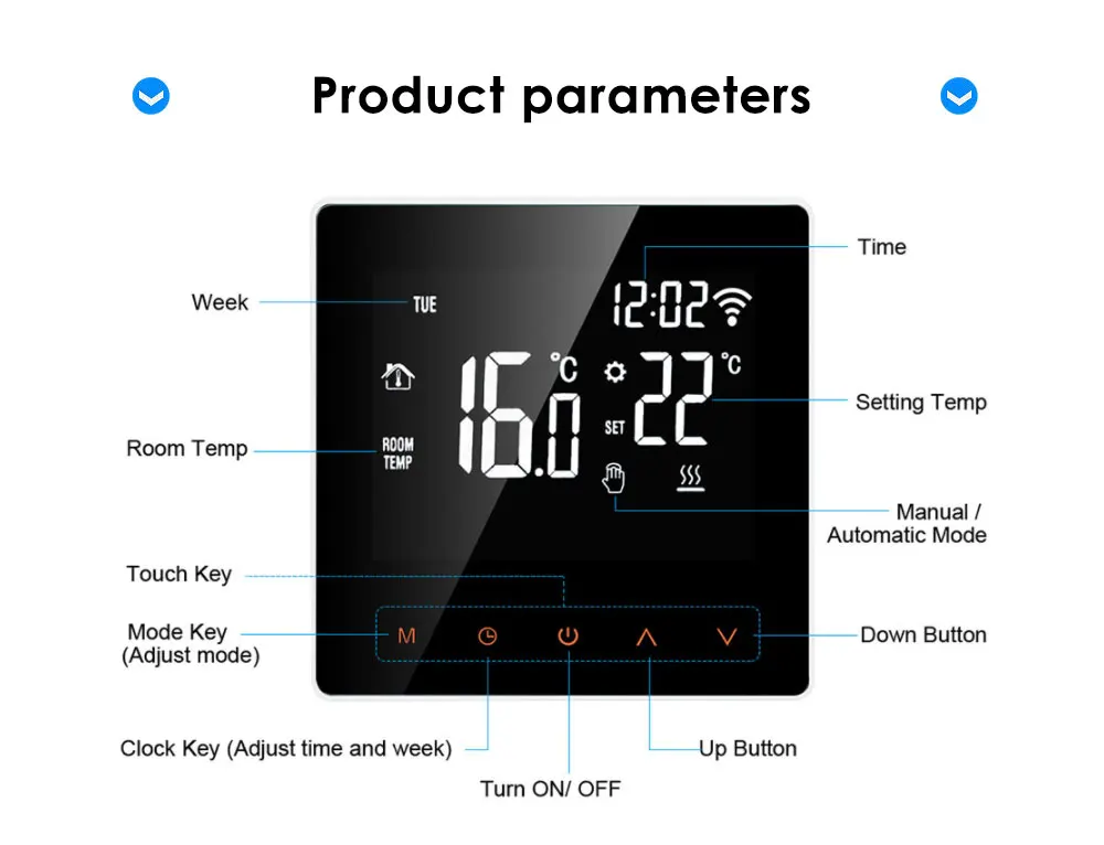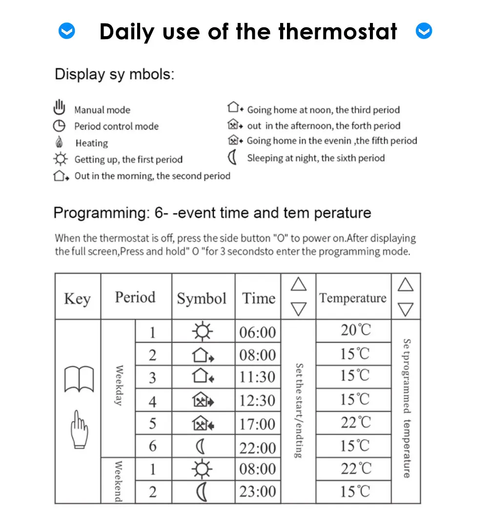 【주간 프로그램 가능】 온도 조절기는 매일 6 가지 시간 모드에 따라 다른 온도 설정을 지원합니다.