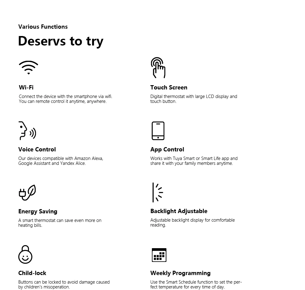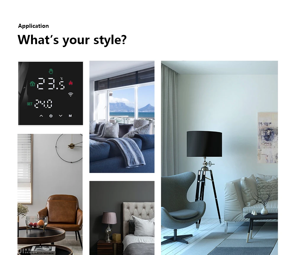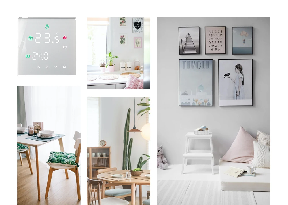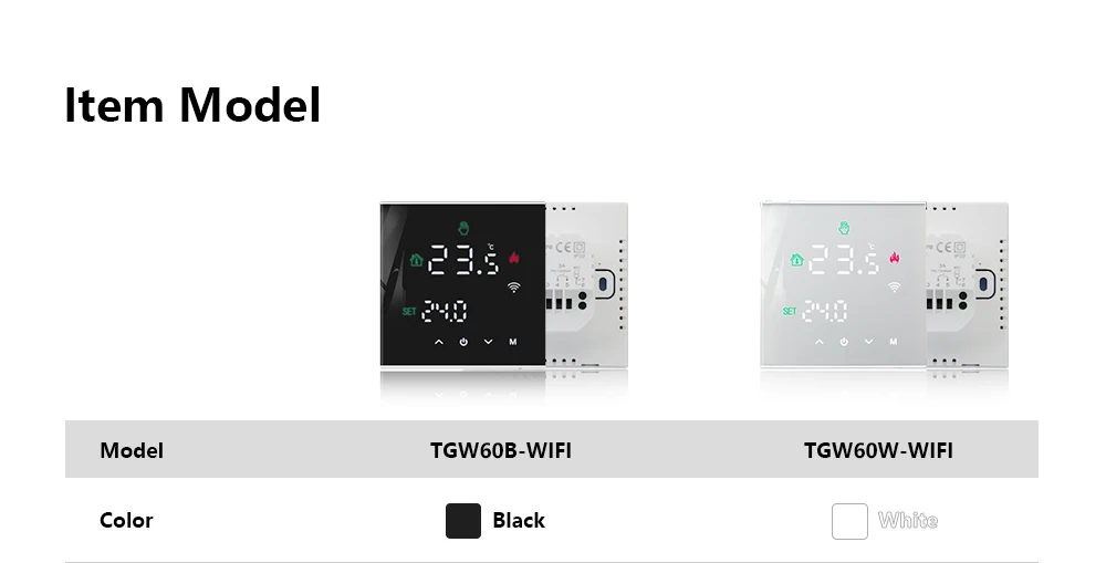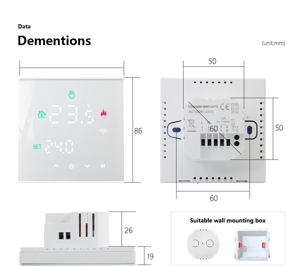 온도 조절기 플러시 장착, 장착 상자: 86x86mm 정사각형 또는 유럽 60mm 원형 상자, 최대 온도 조절기는 접착제 및 나사 고정 덕분에 복잡한 배선이 필요하지 않습니다.