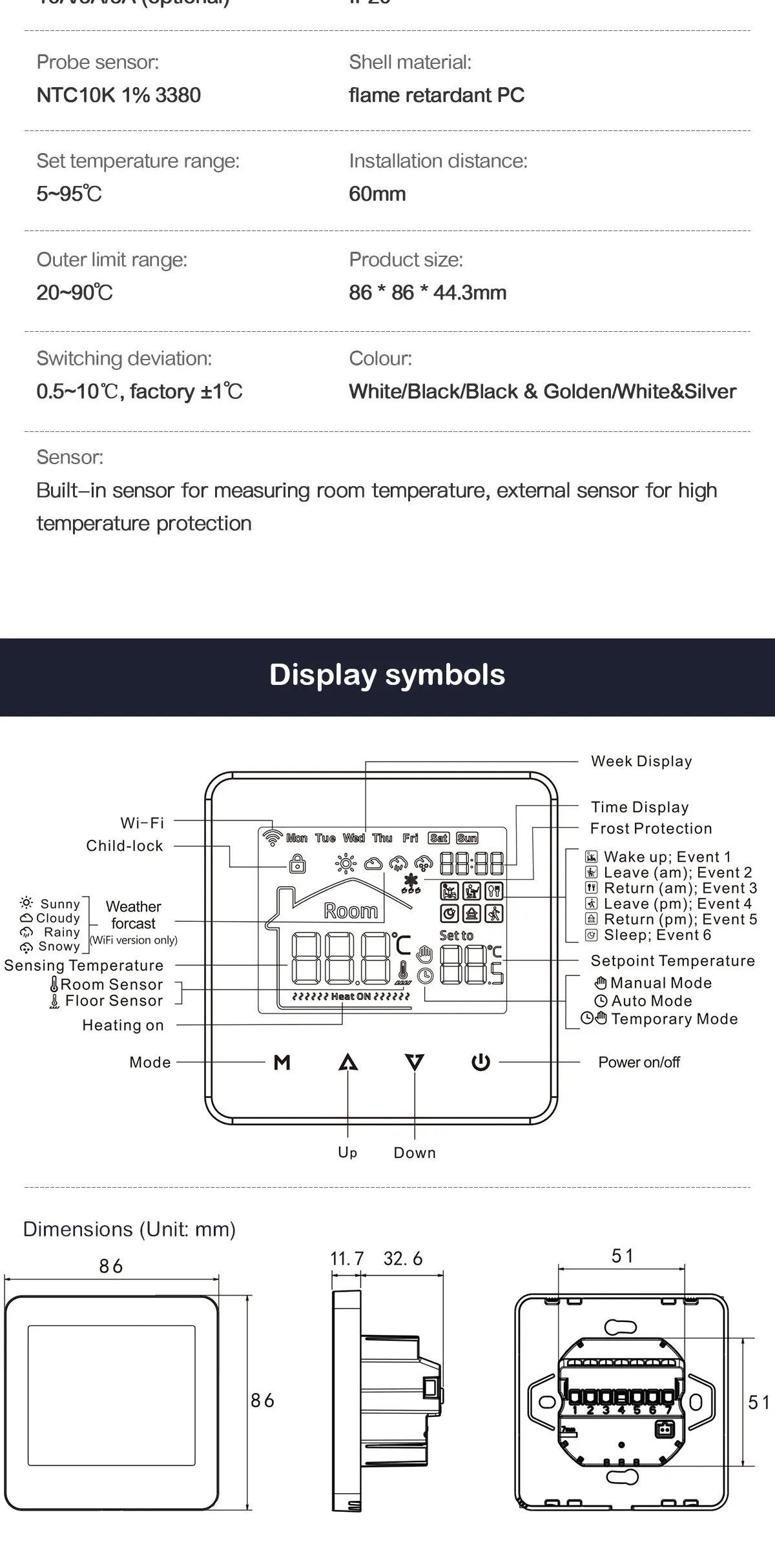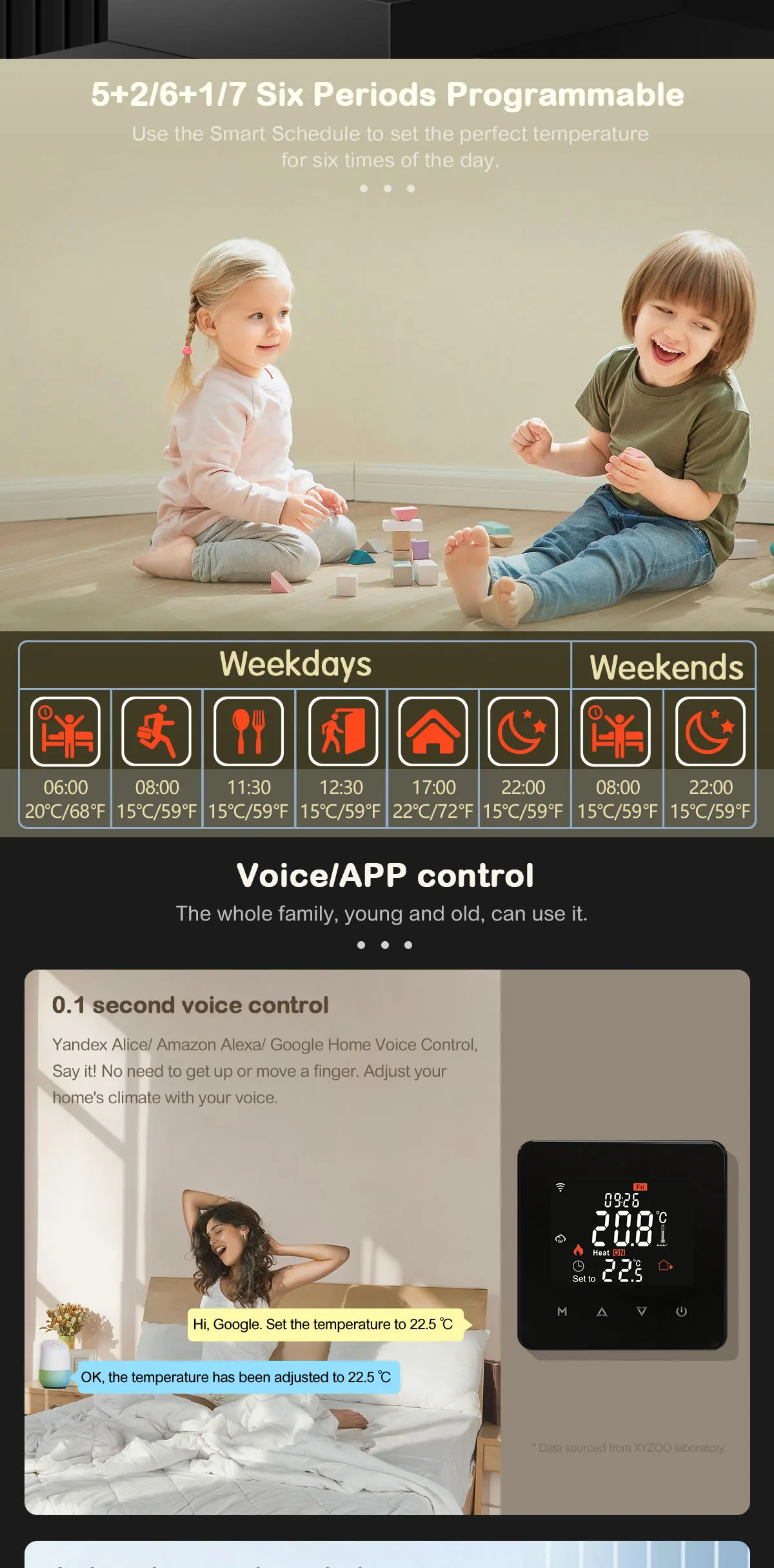 라이프 스타일에 맞는 일정을 만들기 위해 하루 6 시간 동안 6 + 1, 5 + 2 및 7 일 동안 주간 온도를 자동 또는 수동으로 설정하십시오.