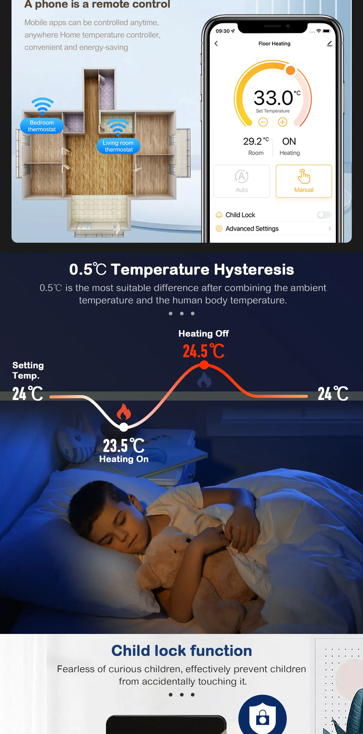 Smart Life APP를 통해 언제 어디서나 집 온도를 원격 제어하고 가족에게 공유 장치를 지원합니다