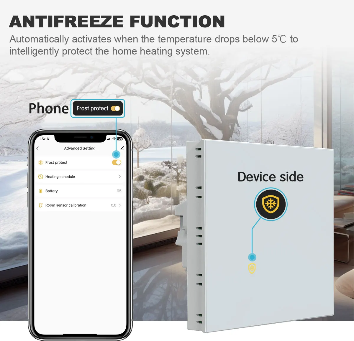 가정 난방 시스템을 지능적으로 보호하기 위해 온도가 5 ℃ 이하로 떨어지면 자동으로 활성화됩니다.
