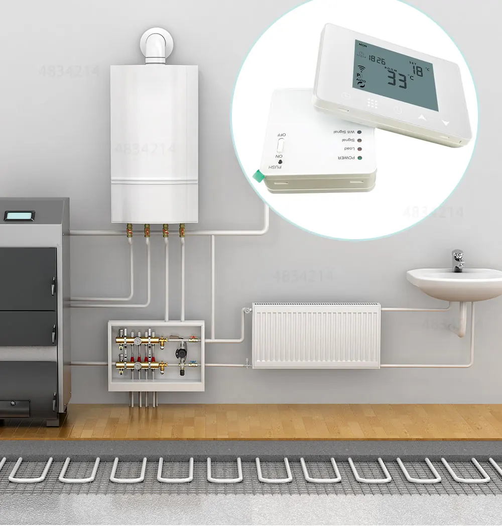 TUYA 스마트 가스 보일러 무선 와이파이 RF 온도 조절기 및 6 서브 챔버 허브 컨트롤러 바닥 난방 케이블