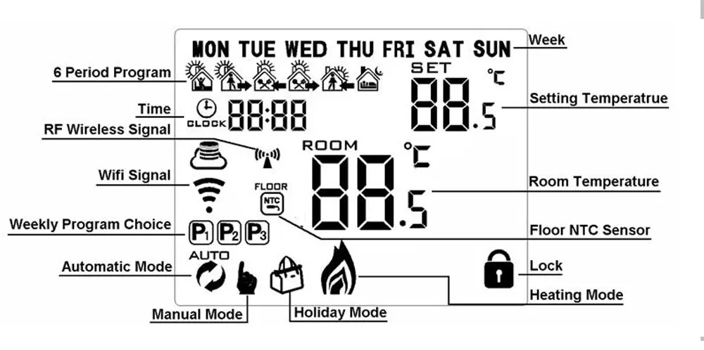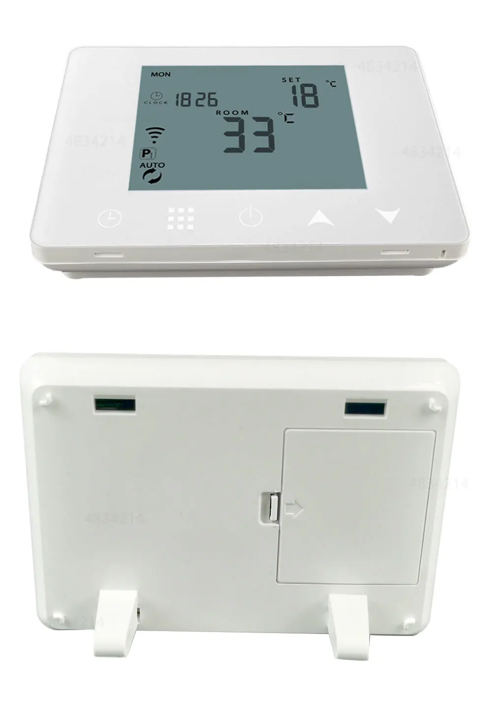 4. 주간 프로그래밍 가능: 전체 자동 프로그램 또는 수동 설정 6 + 1,5 + 2 및 6 시간 기간의 7 일 주간 일정을 지원, 다른 상황에 대 한 최대한의 편의를 제공 합니다. 전원이 꺼져있을 때 데이터 메모리. 게다가, 휴일 모드는 당신이 휴일에 더 편안한 온도를 즐길 수있는 선택 사항입니다.