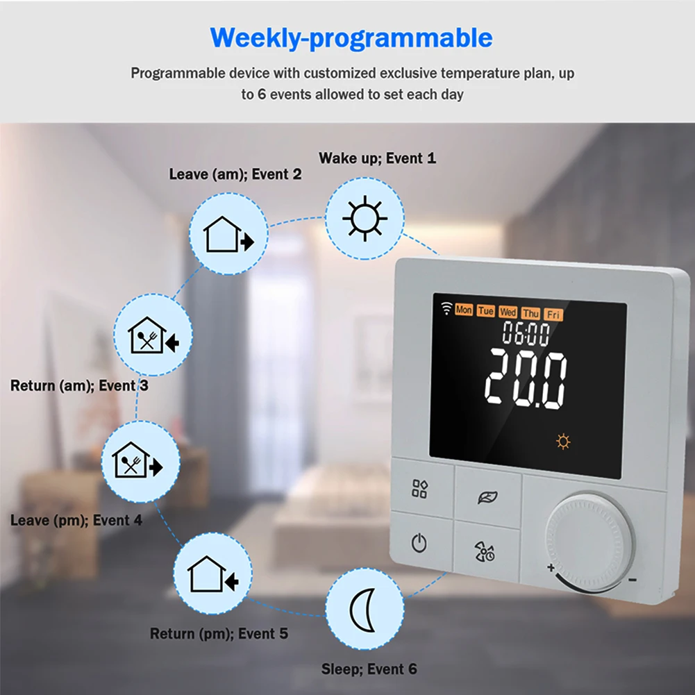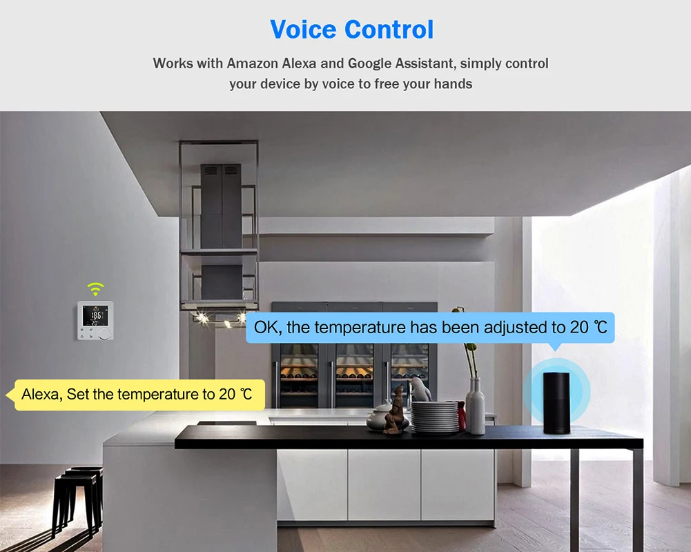 0.5°C Accuracy keeps temperature within the level you set. No limit to add rooms and support Smart Scene. The voice control thermostat supports power-off protection, date memory function when power is off and all setting languages synchronize your time zone, address and language. Voice control and shared device function enables centralized control or multi-channel control, providing utmost convenience to you and your family