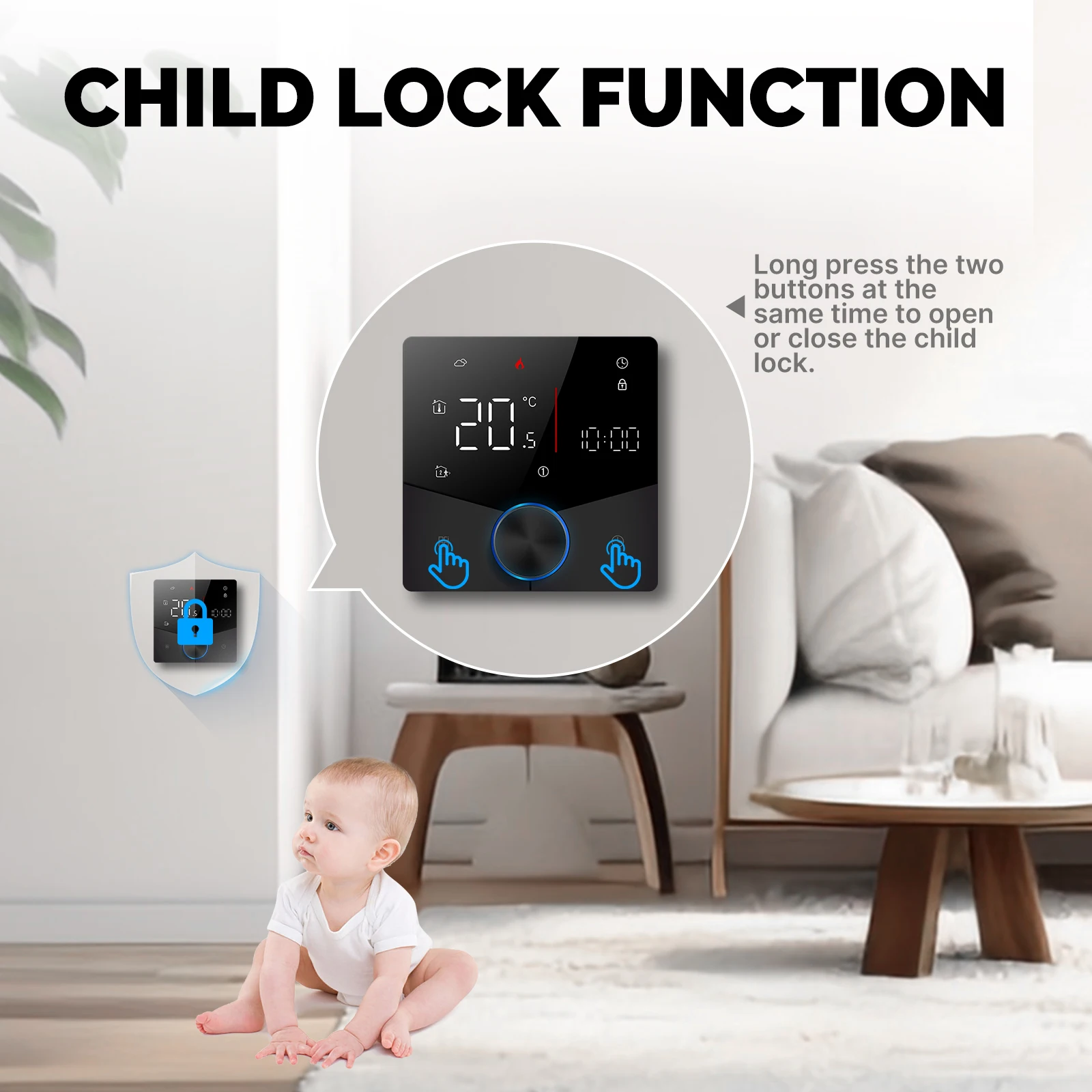 이 기능은 자녀가 온도 조절기를 만질 때 실수로 인한 전기 및 생명 영향의 과다 사용을 방지하기위한 것입니다.