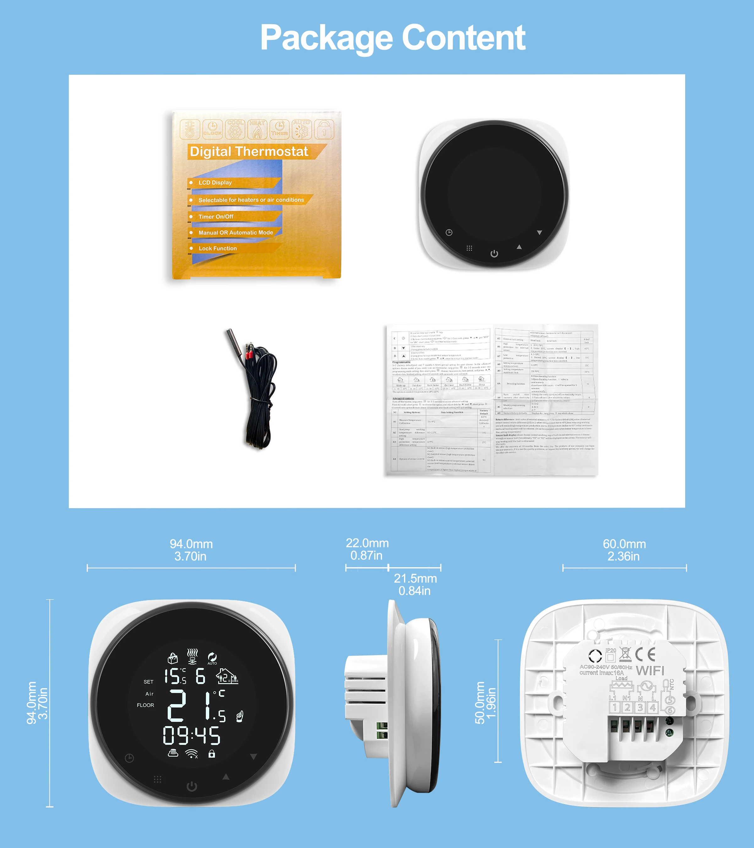 우아하고 민감한 LCD 터치 스크린, 스크래치 방지, 청소하기 쉬운 스마트 온도 조절기.