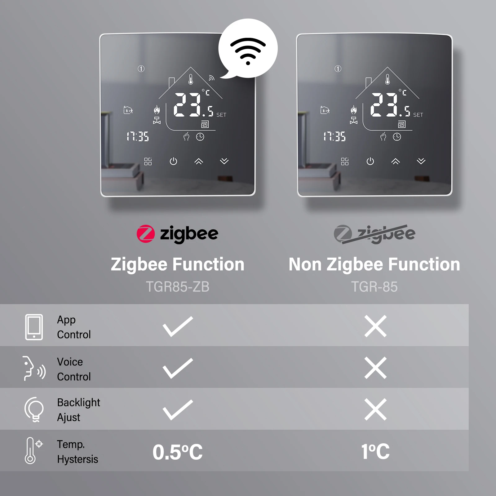 스마트 폰을 통한 앱 원격 제어 지원 하나의 Tuya ZigBee 무선 게이트웨이를 기반으로 온도 조절기를 "스마트 라이프" 앱에 성공적으로 연결 한 후 Alexa 및 Google Assistant를 통한 핸즈프리 음성 제어와 함께