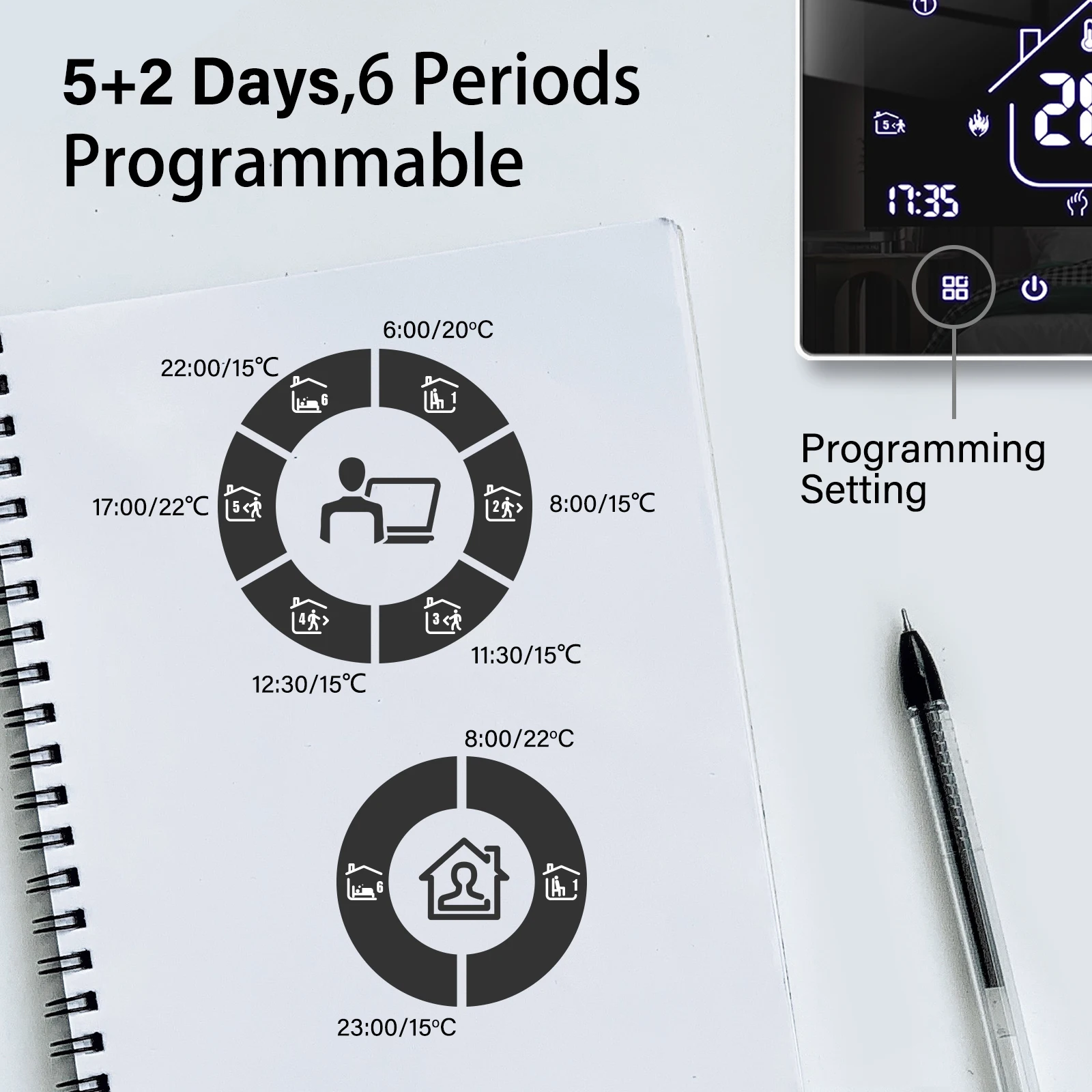 옵션 4 기간으로 5 + 1 + 1 주간 일정 수동 설정 지원, smart Life 및 Tuya 앱에서 다양한 상황에 대한 최대한의 편의성을 제공하고 집 온도에 대한 맞춤형 일정을 설정합니다.