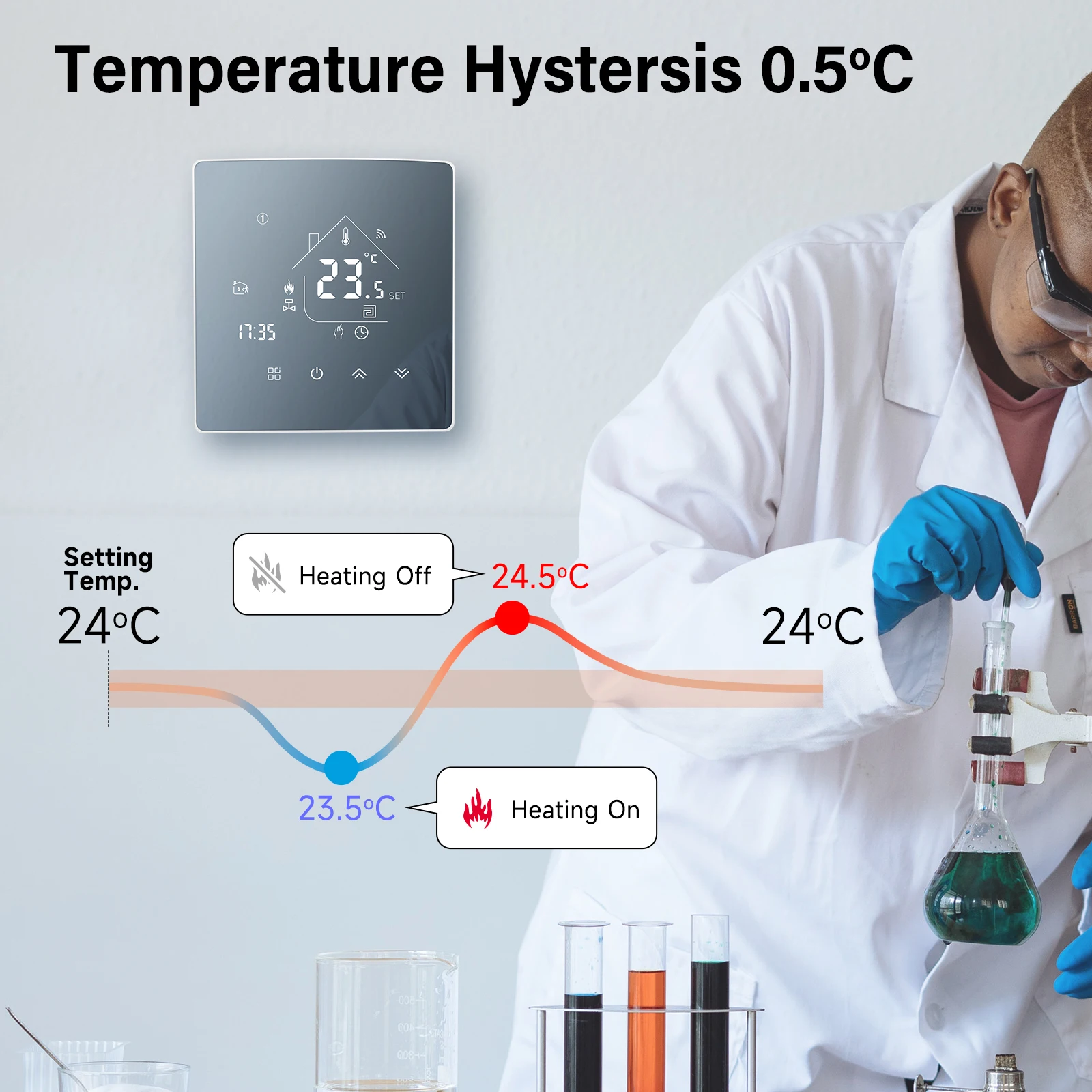 기기에서 더 편리하게 사용할 수 있도록 앱에서 45-70 ℃의 높은 한계 온도 천장과 1-5 ℃의 온도 하한을 설정하십시오. 편의를 위해 가족이나 친구에게 기기를 공유하십시오. 전체 2 년 보증, 모든 스마트 온도 조절기에 대한 60 일 환불 보증, 귀하의 완전한 만족은 모든 고객의 목표입니다.