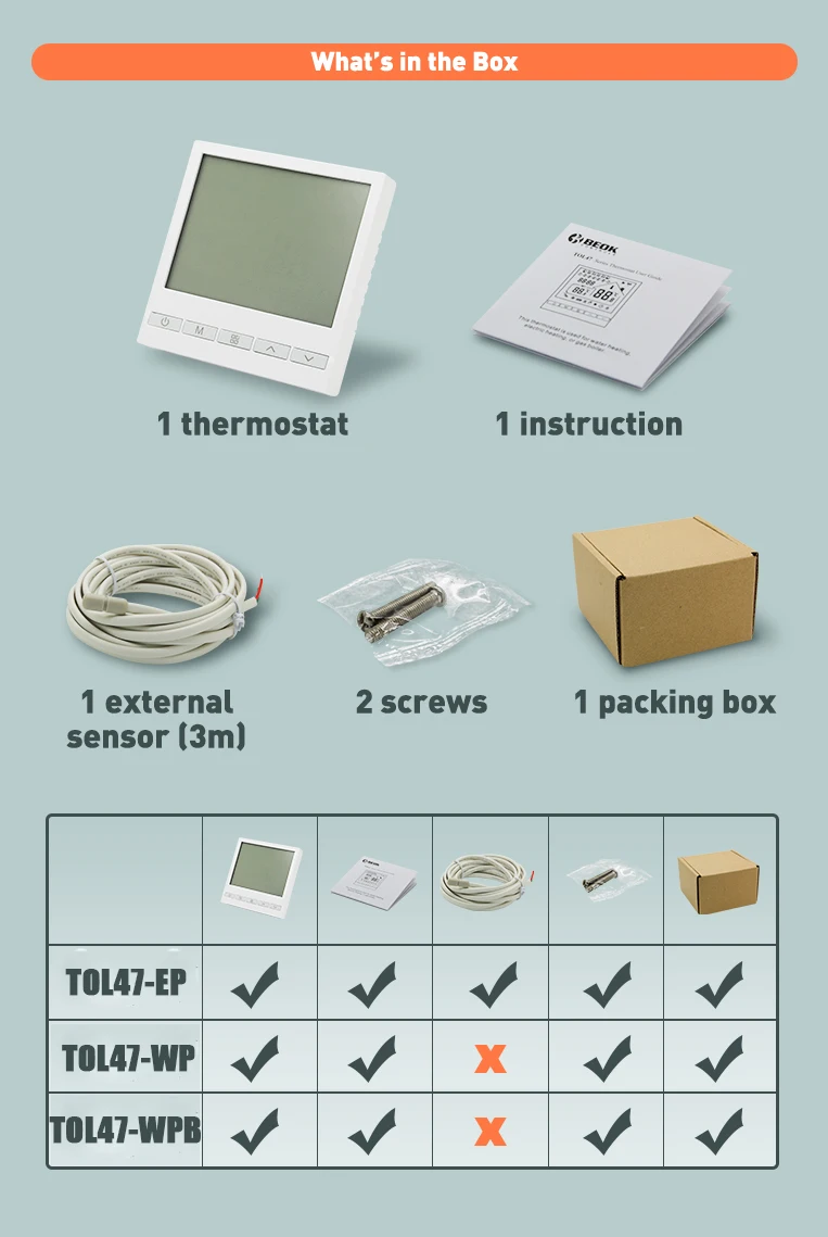 1. 이 제품은 대형 LED 화면이있는 푸시 버튼 온도 조절기입니다. 아이보리 화이트 디자인과 라이트 블루 디스플레이로 모든 스타일의 장식에 적합합니다.