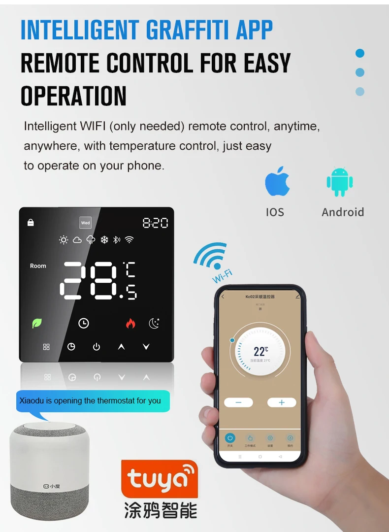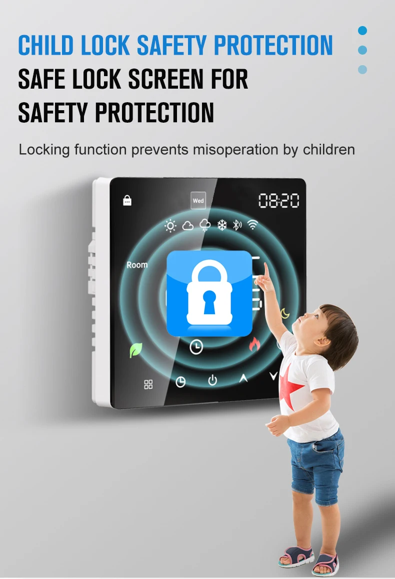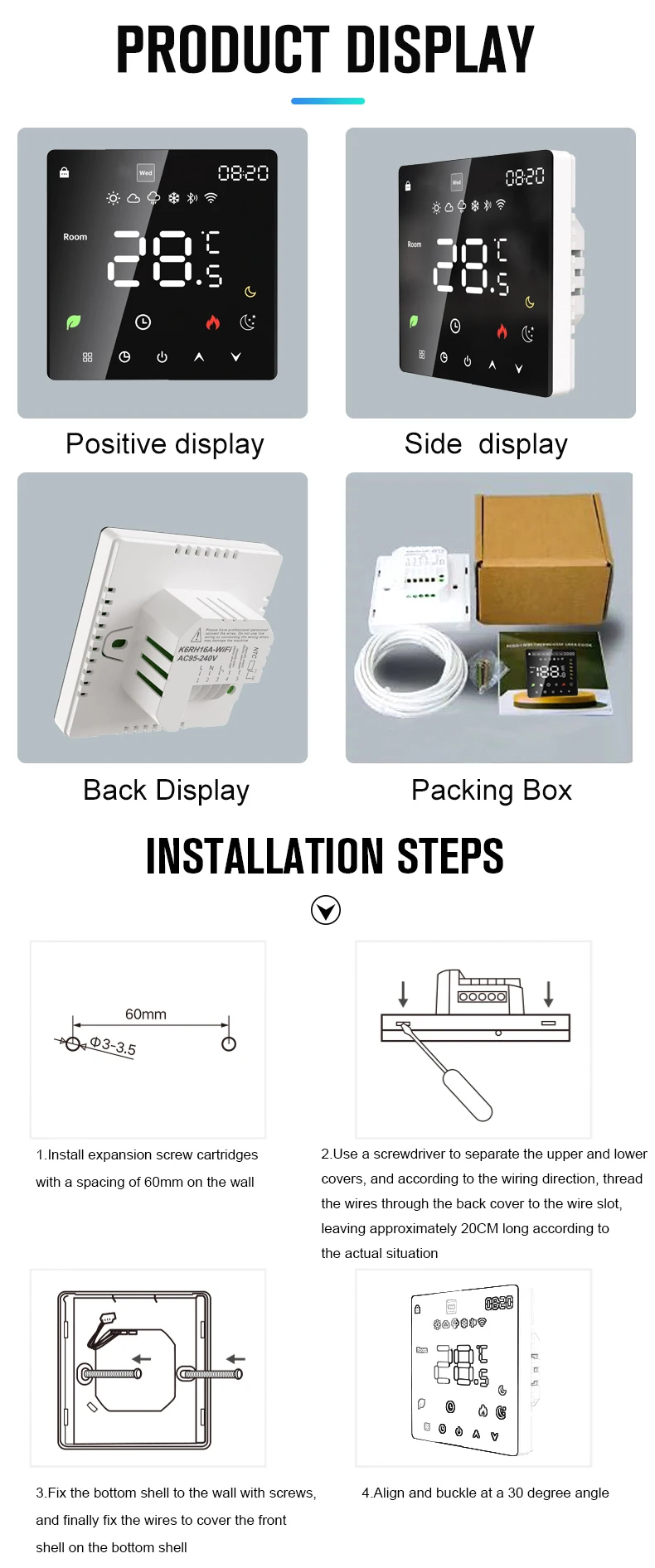 스마트 물 가열 온도 조절기는 가정용 바닥 난방 시스템 또는 보일러와 같은 난방 시스템의 실내 온도 제어에 적합합니다. 아시아, 유럽 및 미국에서 널리 사용할 수 있습니다. 장식 스타일을 완벽하게 혼합하고 커스터마이징을 지원합니다.