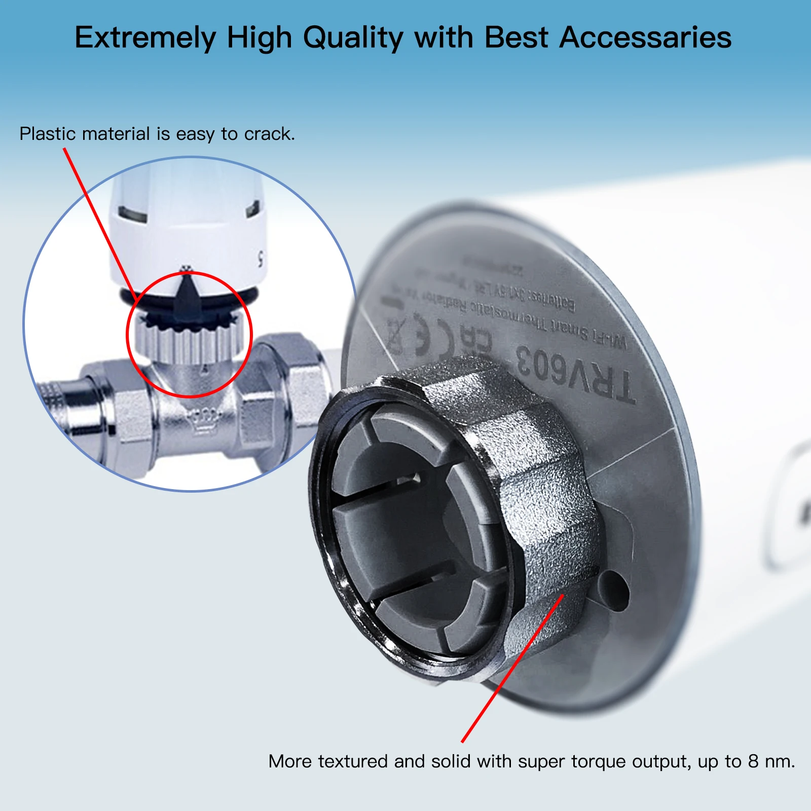 【새로운 디자인】 글로벌 이니셔티브로 최대 8 nm 의 슈퍼 토크 출력을 갖춘 새로운 LED 도트 매트릭스 디스플레이, 새로운 특허 TRV 컨트롤러. 이 새 버전은 다양한 각도에서 온도를 읽을 수있는 회전식 LED 화면으로 특징 지어집니다. AA 알카라인 배터리의 세 섹션 전원, 크게 하루에 에너지의 23.592mAH 소비의 측정 된 테스트 결과와 전력 소비를 줄이고 약 76 일 동안 사용할 수 있습니다.