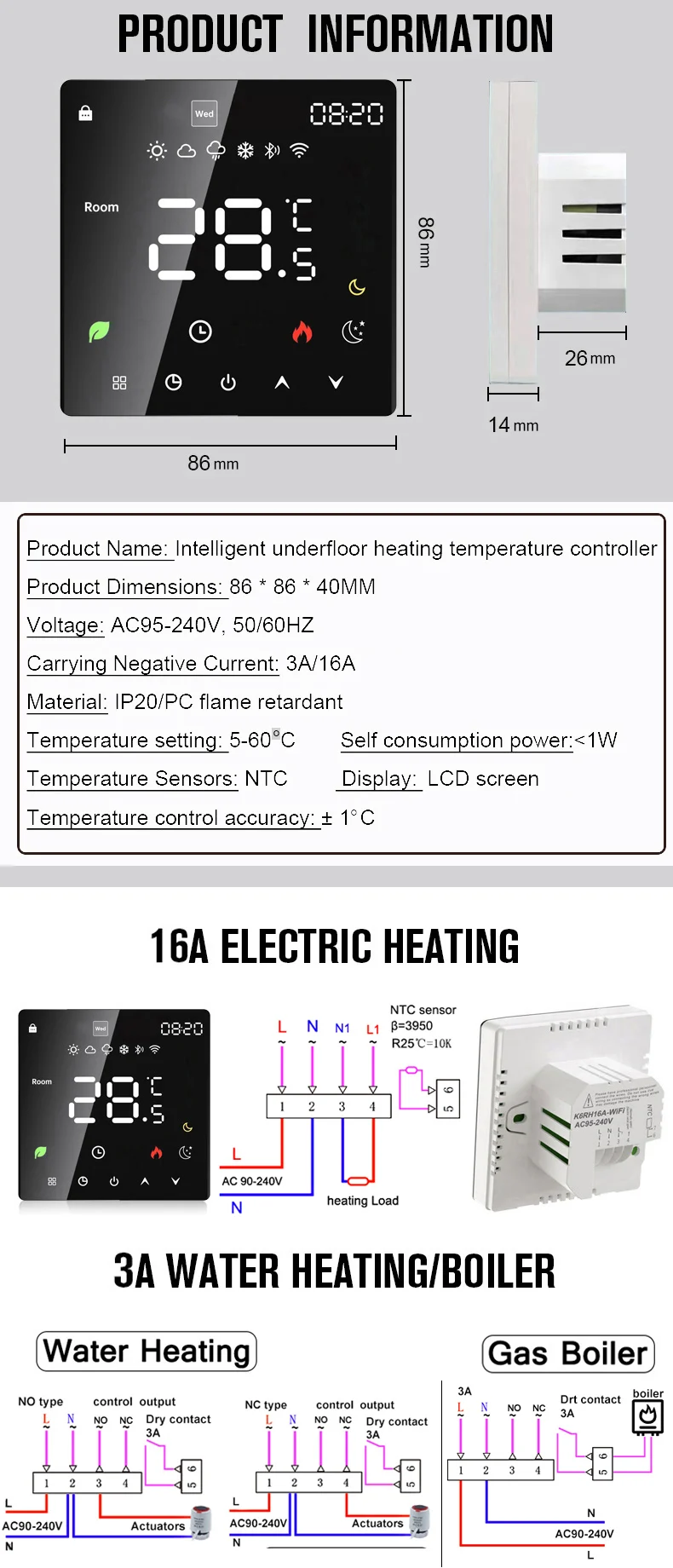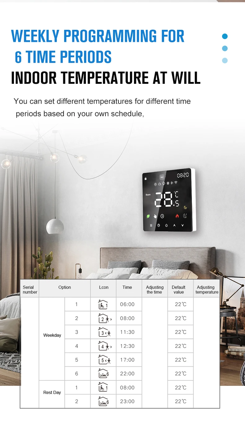 스마트 물 가열 온도 조절기는 가정용 바닥 난방 시스템 또는 보일러와 같은 난방 시스템의 실내 온도 제어에 적합합니다. 아시아, 유럽 및 미국에서 널리 사용할 수 있습니다. 장식 스타일을 완벽하게 혼합하고 커스터마이징을 지원합니다.