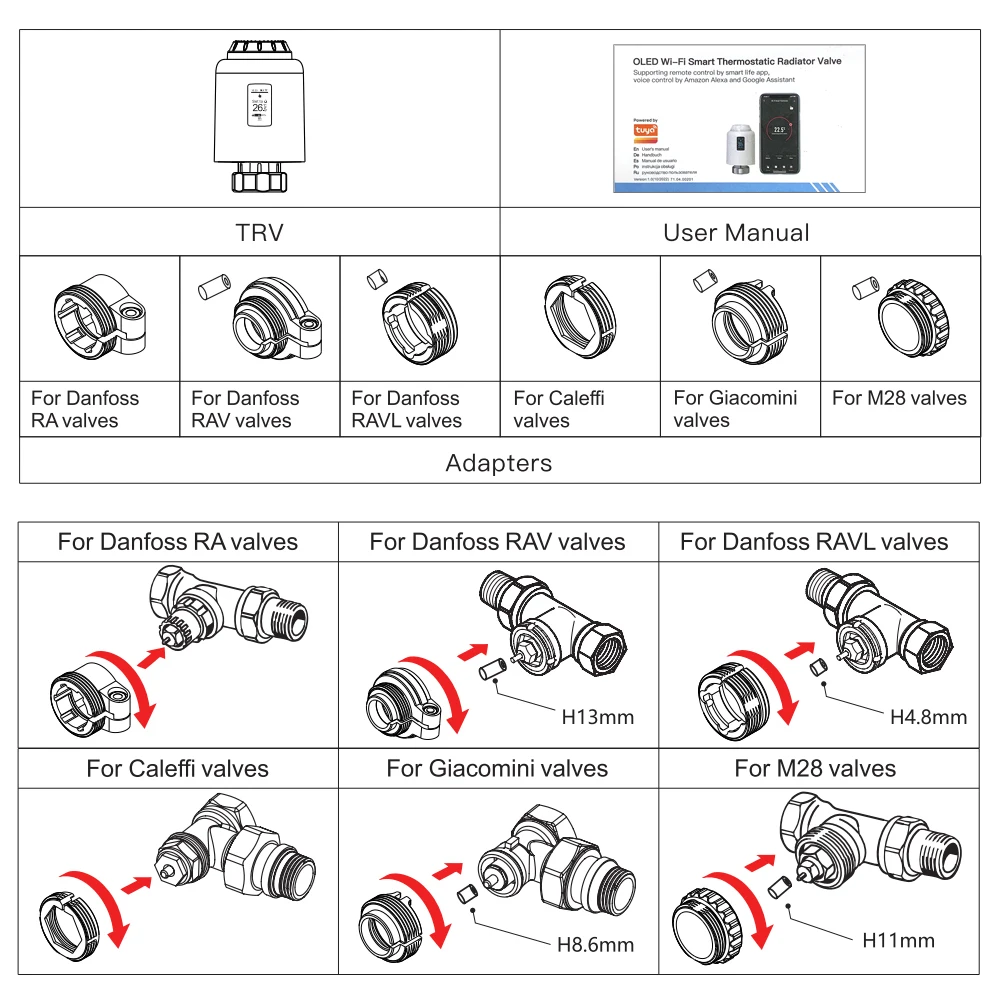 호환 가능: 6 가지 종류의 어댑터 액세서리 제공 (Danfoss RA & RAV & RAVL, Caleffi, Giacomini, M28 밸브)