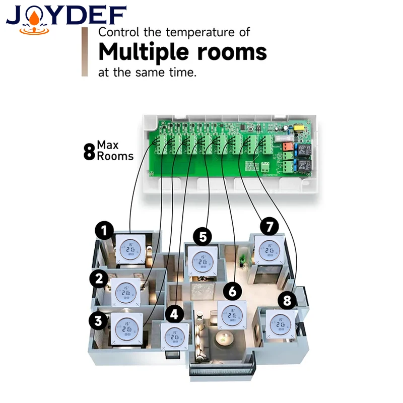 According to user"s set temperature, hub controller can control to open or close boiler/circulating pump/electric actuators to achieve the purpose of comfort and energy consumption saving.