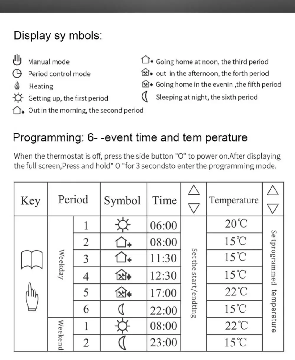 6. [주간 프로그램 가능]-매주 5 2/6 1/7 일을 프로그래밍 할 수 있으며, 평일에는 6 시간, 주말에는 2 시간 기간을 다른 온도로 설정할 수 있습니다.