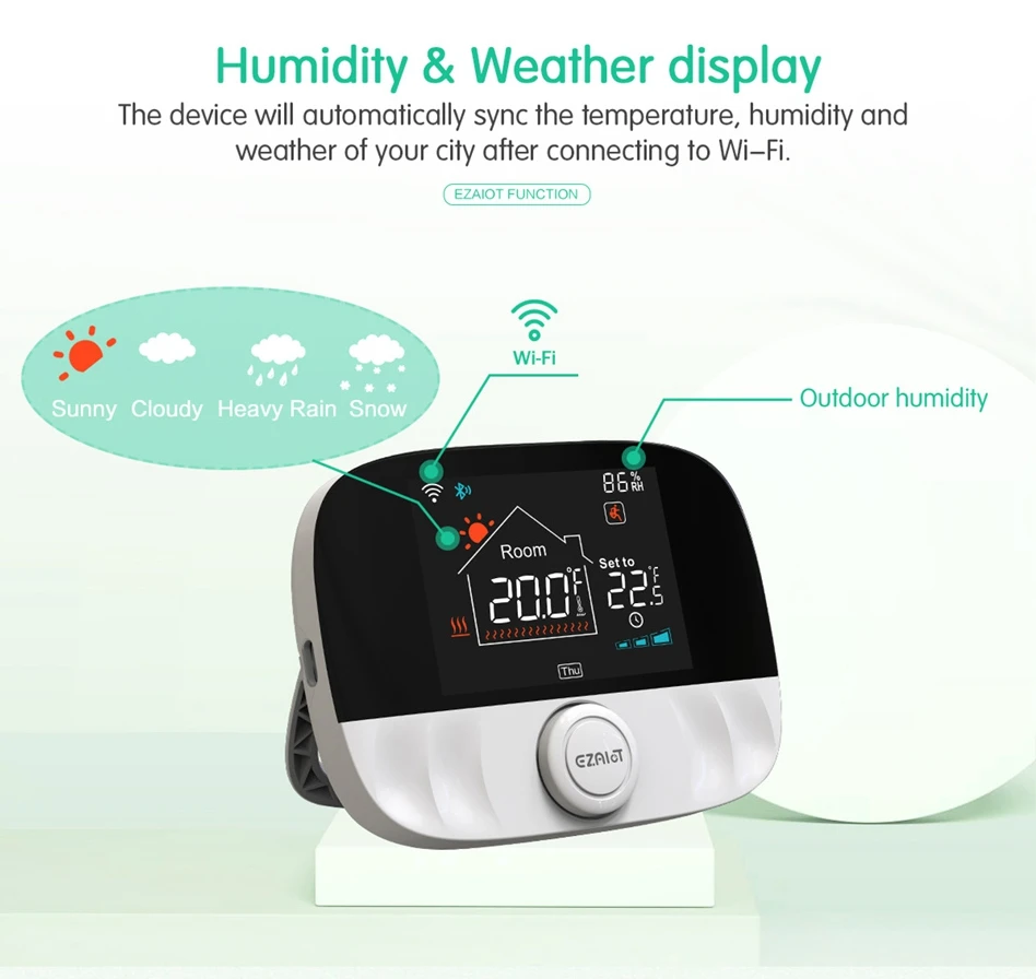 이 장치는 Wi-Fi에 연결 한 후 도시의 온도, 습도 및 날씨를 자동으로 동기화합니다.