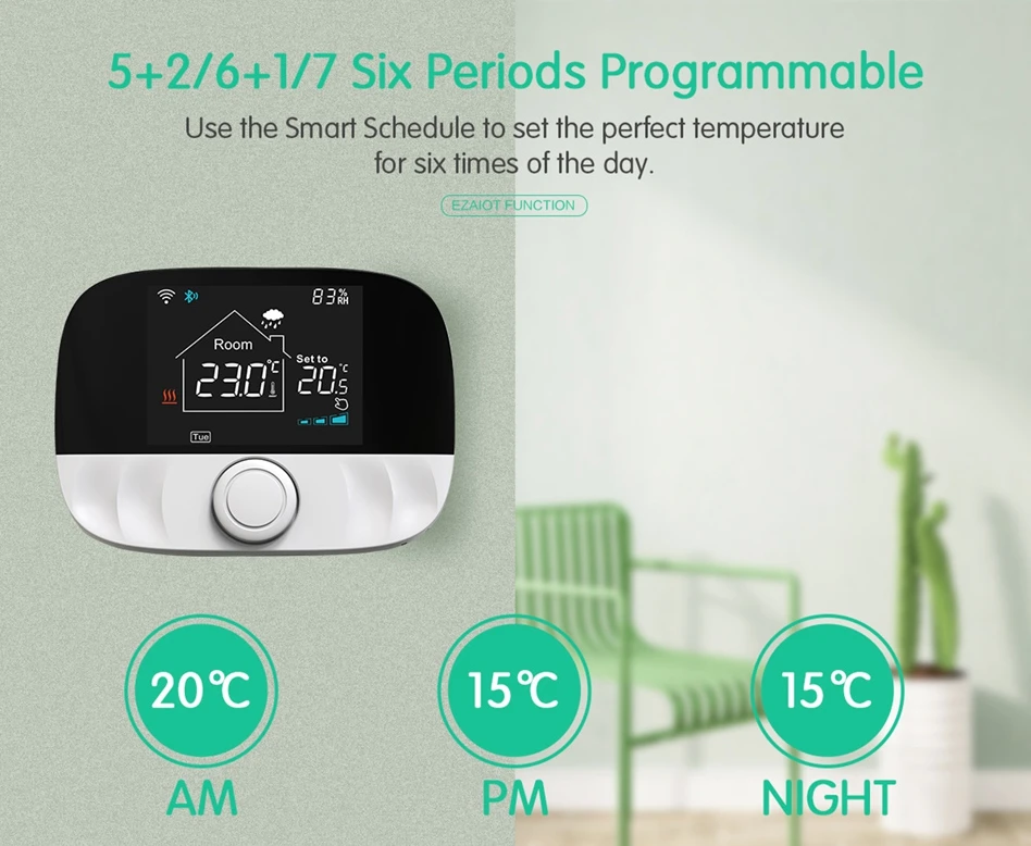 지원 5 + 2/6 + 1/7 일 6 시간 슬롯 프로그래밍, 스마트 일정을 사용하여 하루의 완벽한 온도를 설정합니다.