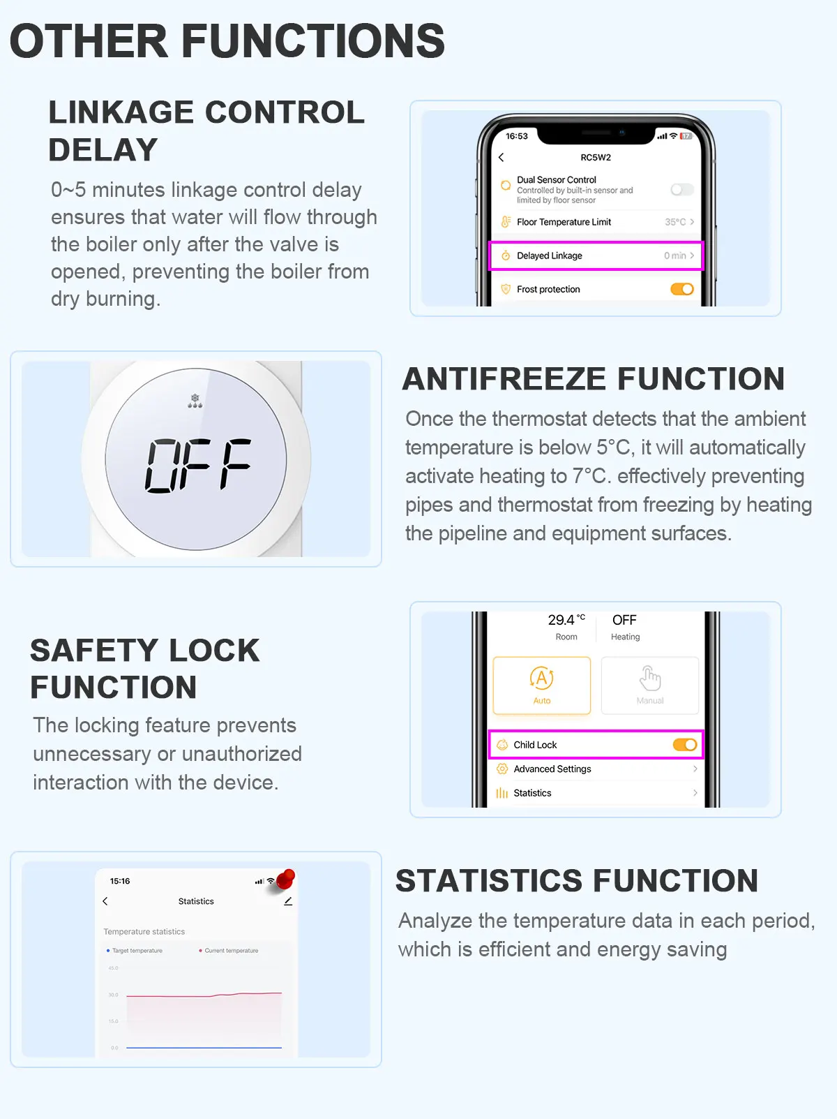 저전력, 신뢰성 높은 RF433 신호 통신 기술을 활용하여 서모 스탯과 수신기 사이의 안정적이고 신뢰할 수 있는 연결을 보장하여 쉬운 단절 또는 페어링 문제를 방지합니다.