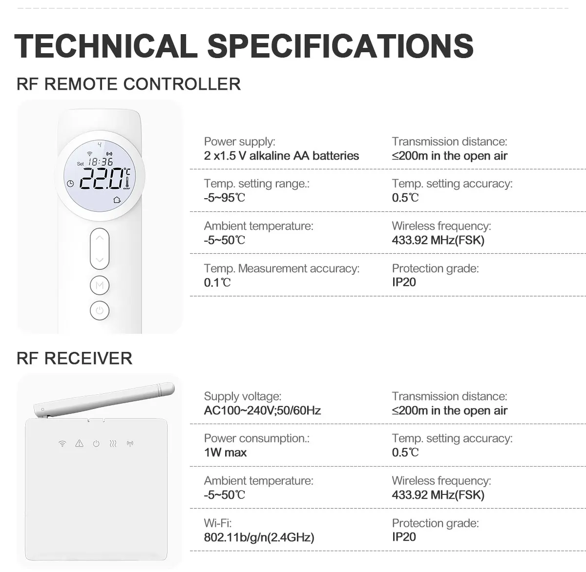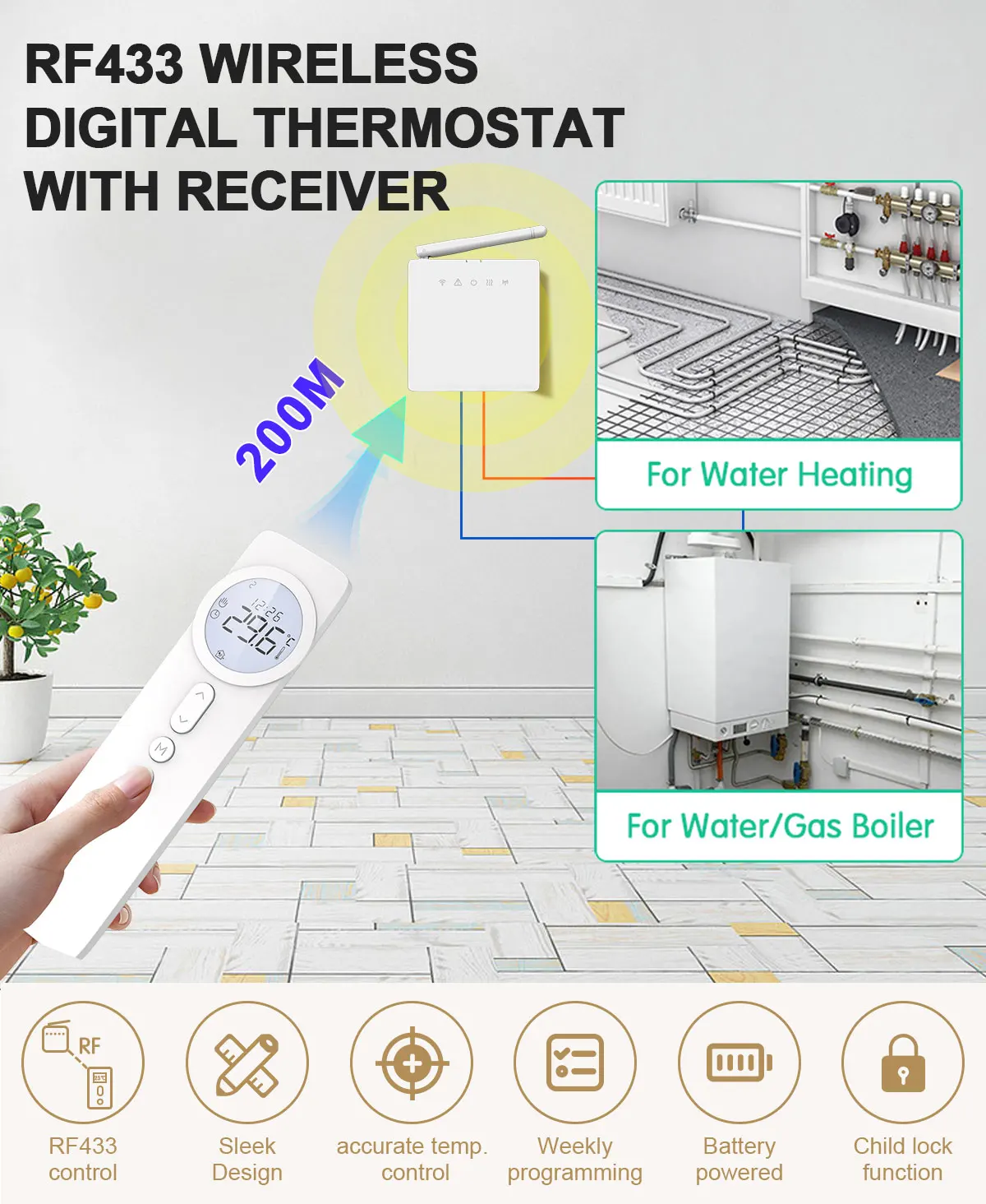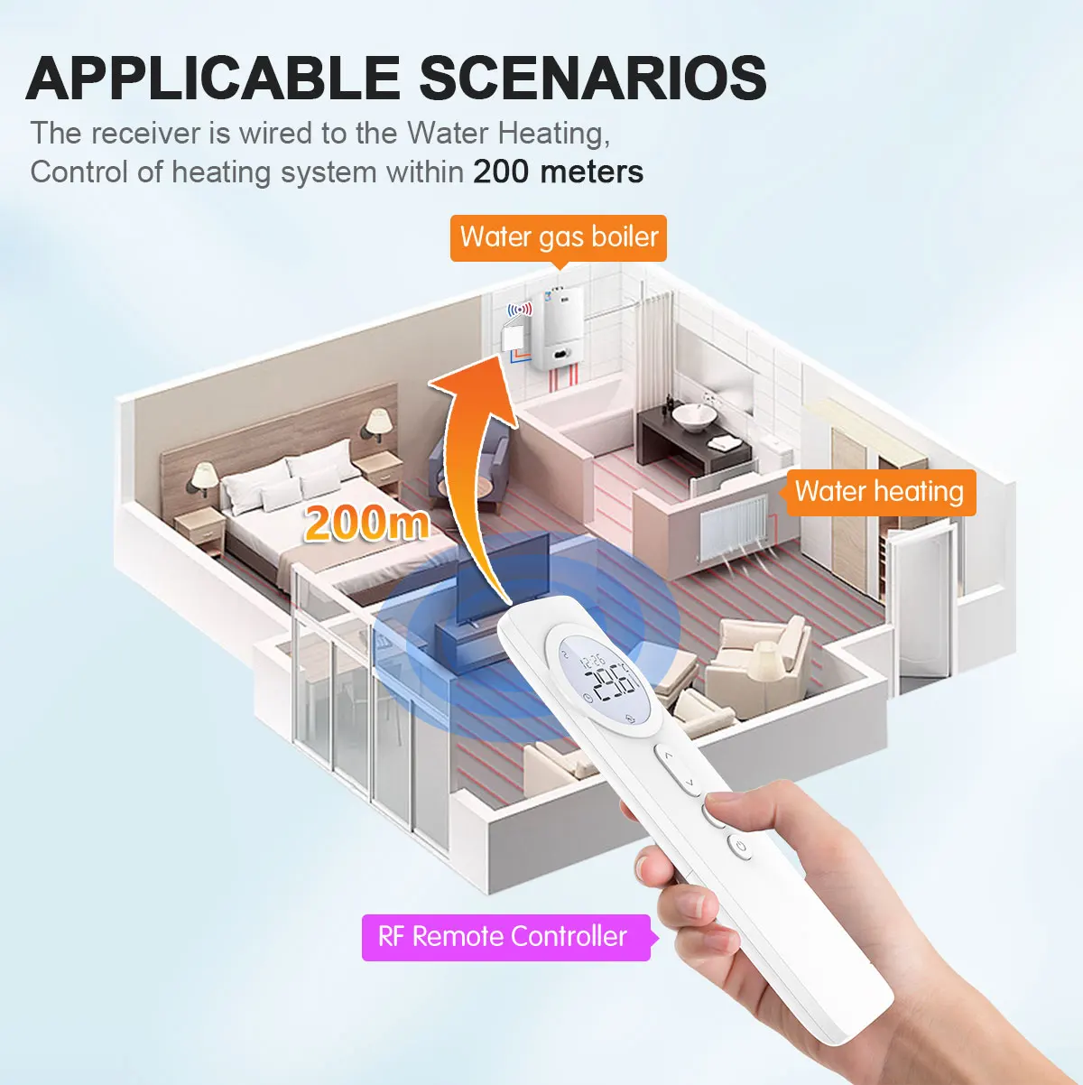 온도 조절기는 배선이 필요하지 않습니다. 수신기는 물 가열 시스템에 배선되어 있으며,서모 스탯이 최대 200 미터 떨어진 곳에서 수신기를 제어 할 수 있도록합니다..