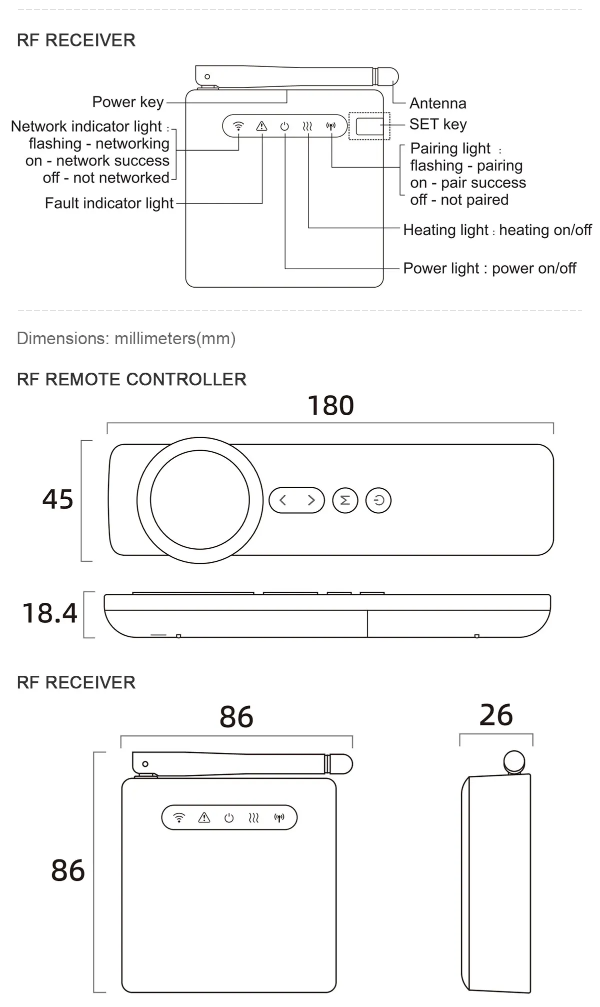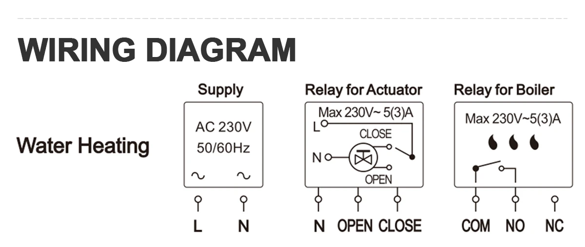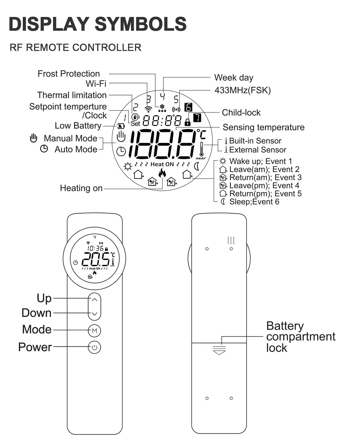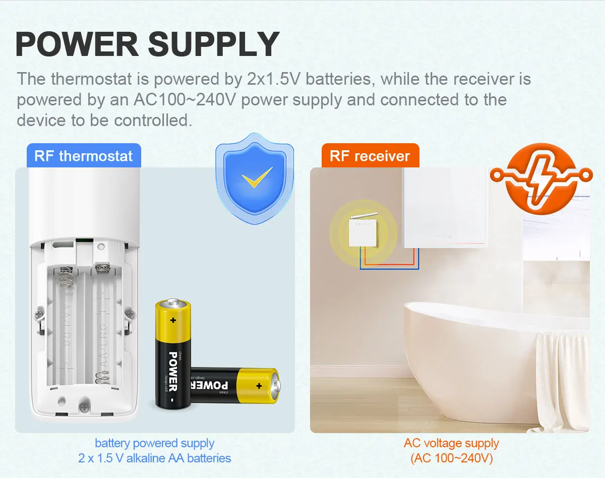 온도 조절기는 배선이 필요하지 않습니다. 수신기는 물 가열 시스템에 배선되어 있으며,서모 스탯이 최대 200 미터 떨어진 곳에서 수신기를 제어 할 수 있도록합니다..