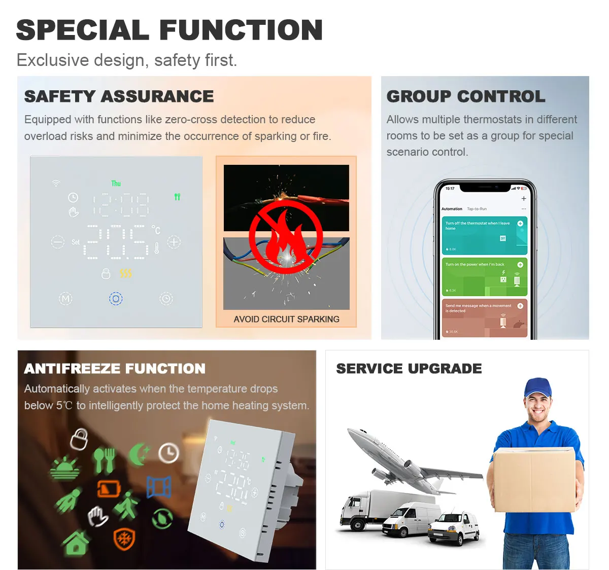 ? 스마트 온도 제어 시스템:EZAIOT의 스마트 서모 스탯은 물/전기 바닥 난방 및 가스 보일러를 조절하여 최적의 편안함과 효율성을 보장하는 정교한 제어 시스템입니다.