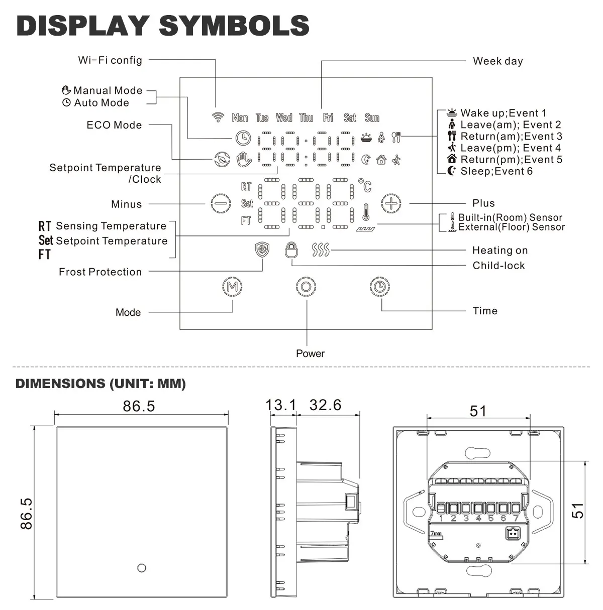 5 + 2/6 + 1/7 일, 근무일에는 6 시간, 주말에는 2 시간 동안 다른 온도를 설정할 수 있습니다. 기기 오프라인 및 APP 온라인 설정 지원