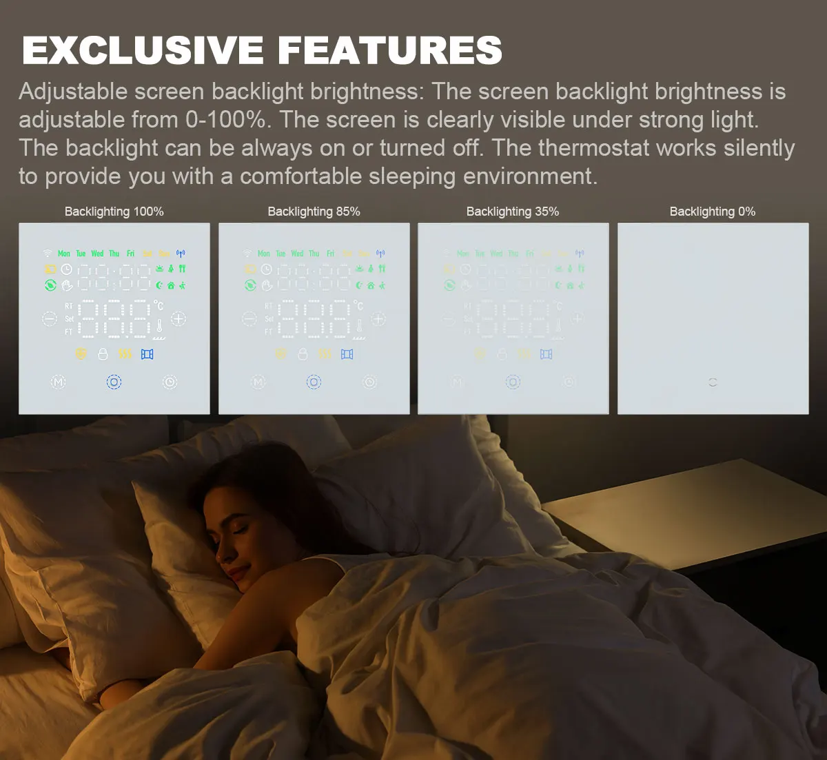 화면 백라이트 밝기는 0-100% 에서 조정할 수 있습니다. 강한 빛 아래에서 화면이 선명하게 보입니다. 백라이트는 항상 켜거나 끌 수 있습니다. 온도 조절기는 편안한 수면 환경을 제공하기 위해 조용히 작동합니다.