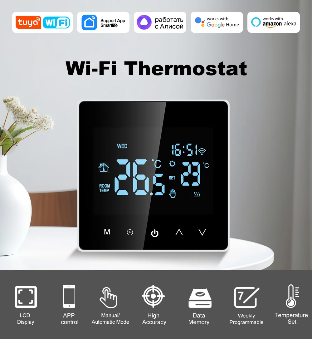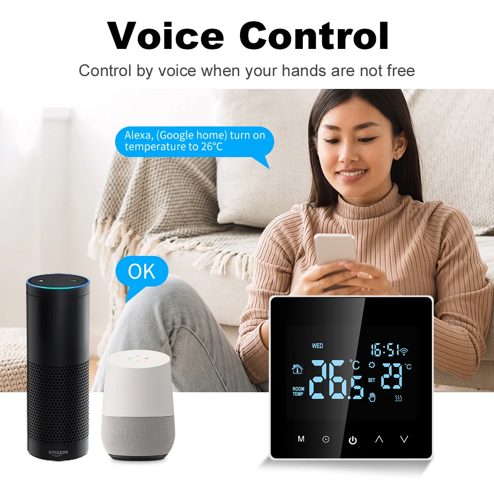 스마트 와이파이 온도 조절기는 아마존 알렉사, 구글 홈, Yandex 앨리스와 완벽하게 호환됩니다. Yandex Alice,Alexa 또는 Google Home Assistant에 음성 명령을 내리면 이동 중에도 기기를 제어 할 수 있습니다.