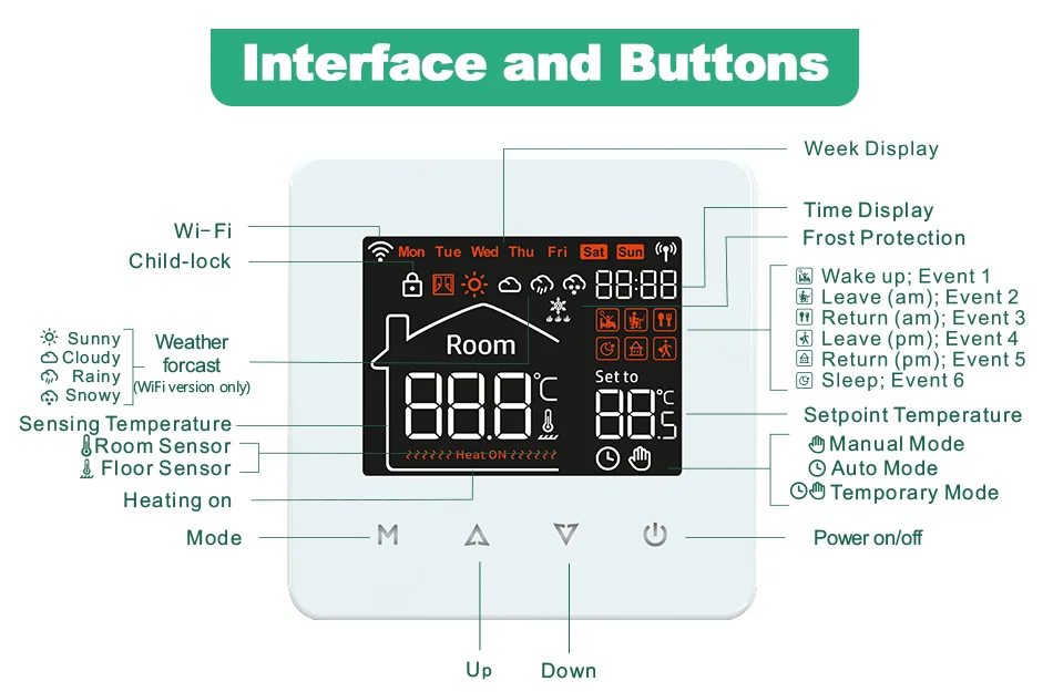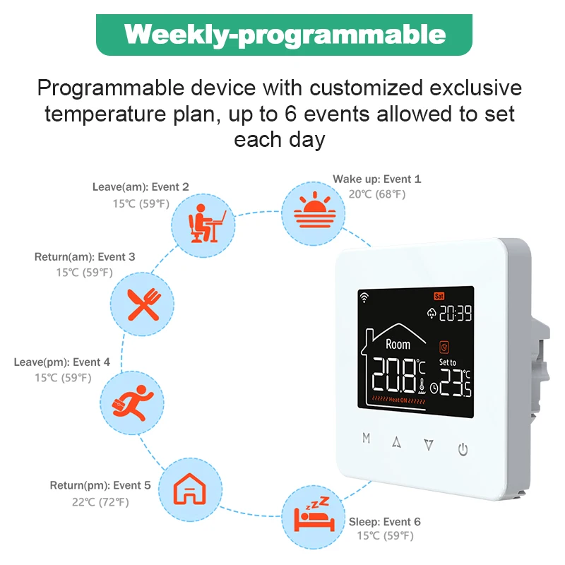 온도 조절기는 매일 6 가지 시간 모드로 다른 온도 설정을 지원합니다. 7 일 프로그래밍 가능