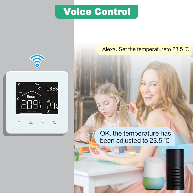 스마트 와이파이 온도 조절기는 아마존 알렉사, 구글 홈과 완벽하게 호환된다. 이동 중에도 기기를 제어하기 위해 Alexa 또는 Google Home Assistant에 음성 명령을 제공하기 만하면됩니다.