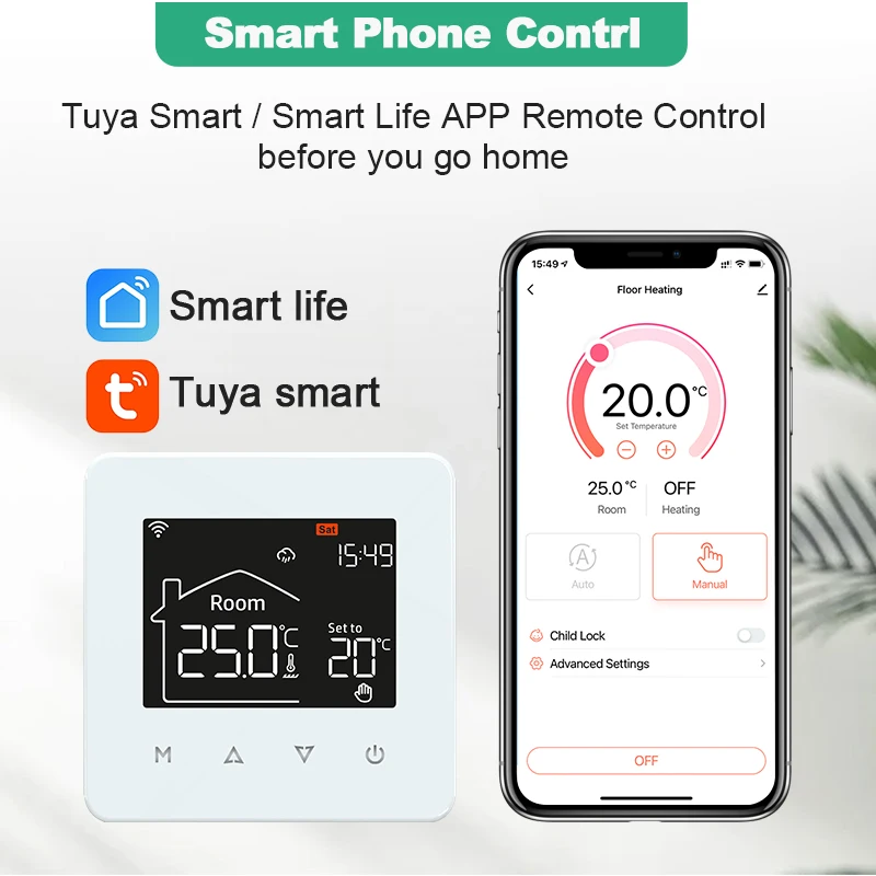 스마트 폰 또는 태블릿을 사용하여 언제 어디서나 무료 앱 Smart Life 또는 TuyaSmart로 스마트 와이파이 온도 조절기를 원격으로 제어하십시오.