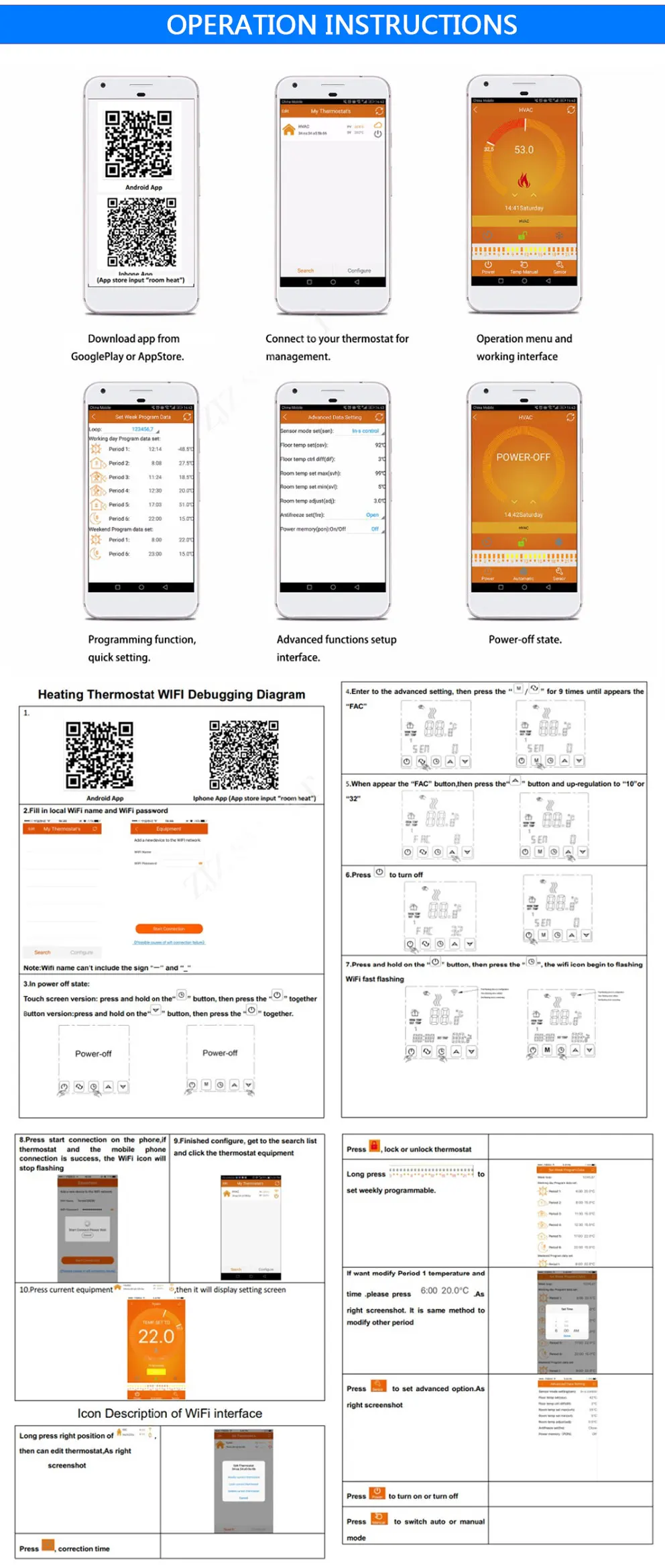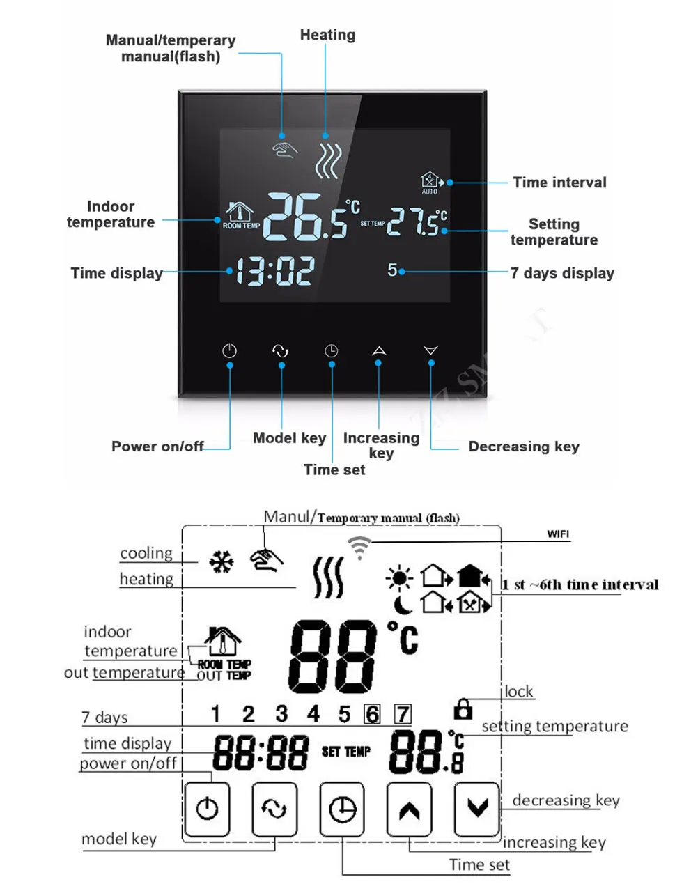 이 Wi-Fi 온도 조절기를 사용하면 스마트 모바일 장치에서 집 온도를 제어 할 수 있으며 Apple 시스템 및 Android 시스템의 스마트 폰과 함께 작동합니다. 설치 및 사용이 쉽고 라이프스타일에 편리하게 맞습니다. 전기 가열 서모 스탯은 전동 볼 밸브, 전동 밸브, 열 밸브, 솔레노이드 밸브, 히터, 전기 가열 필름, 전기 가열 결정 및 전기 바닥 난방을 제어 할 수 있습니다. 보일러, 노, AC 시스템 및 수위 청력에 적합하지 않습니다.
