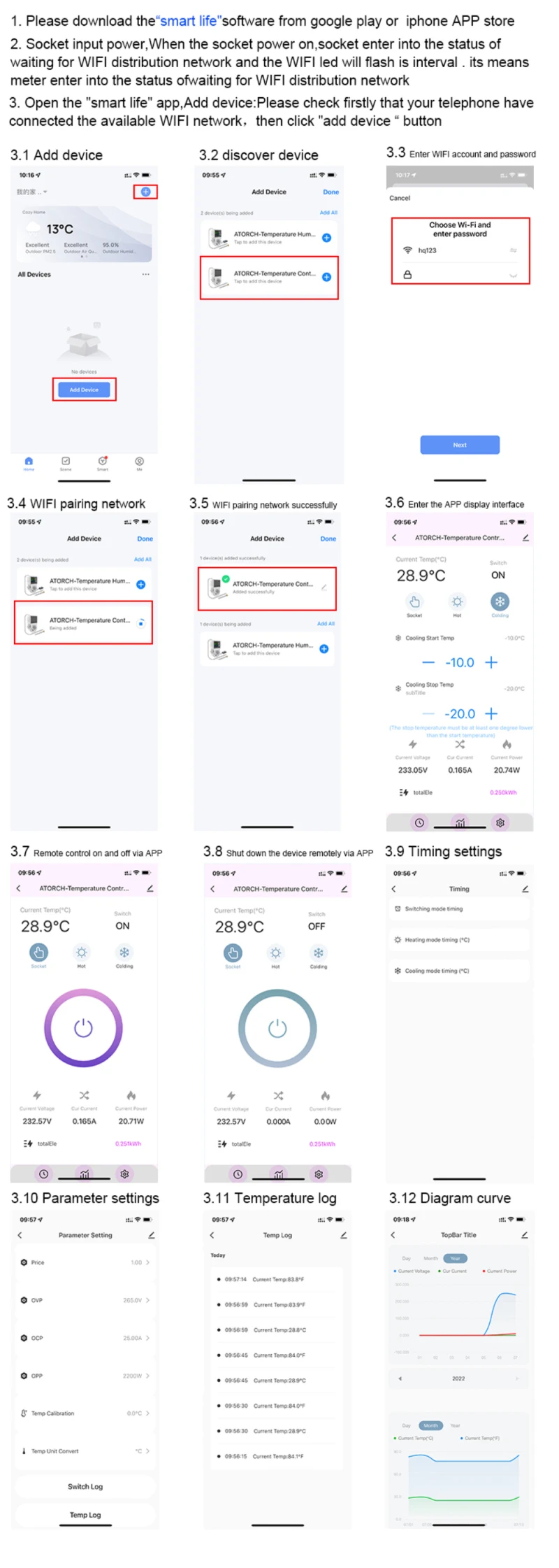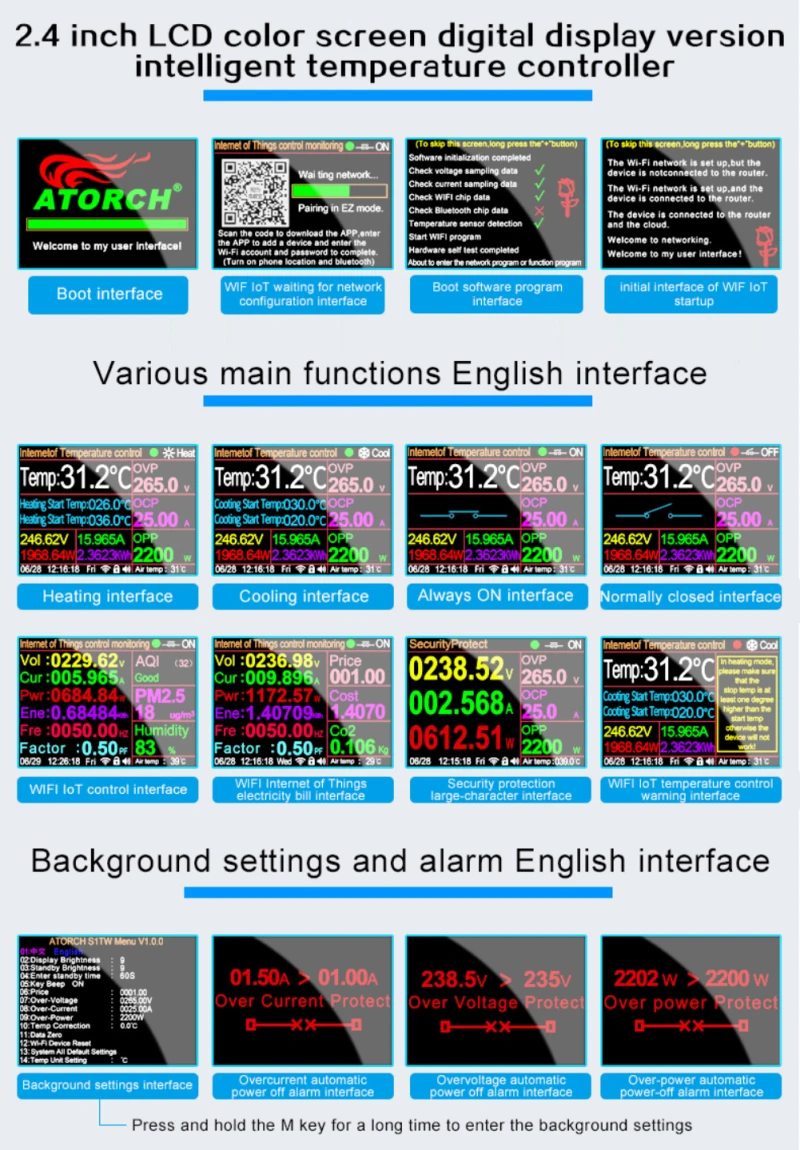WiF 네트워킹 클라우드 원격 지능형 제어 및 전기 미터링은 코드를 스캔하여 스마트 라이프 APP를 다운로드 및 설치하고 단계에 따라 인터넷 클라우드에 성공적으로 연결합니다. 휴대 전화 인터넷 액세스의 원격 제어를 실현하고 타이밍 자동 제어, 실시간 전압의 세 가지 모드를 추가 할 수 있습니다. 현재 및 전력 데이터 계량 디스플레이, 일일 보고서, 월간 보고서, 연간 보고서 및 과거 전압, 전류 및 전력 통계 및 휴대 전화의 과거 온도 통계에 대한 기타 유용한 정보, 고양이 마법사 Xiaodu 오디오를 추가하여 언어 지능형 제어, 호스트의 컬러 화면에는 달력 시간과 주, 현재 온도 및 습도, 대기 질 및 포름 알데히드 농도 및이를 고려하여 생활에 필요한 기타 데이터가 표시 될 수 있습니다. 토치 ⅥF 온도 컨트롤러는 가정용 전기 제어 및 전기 측정에 이상적인 선택입니다.