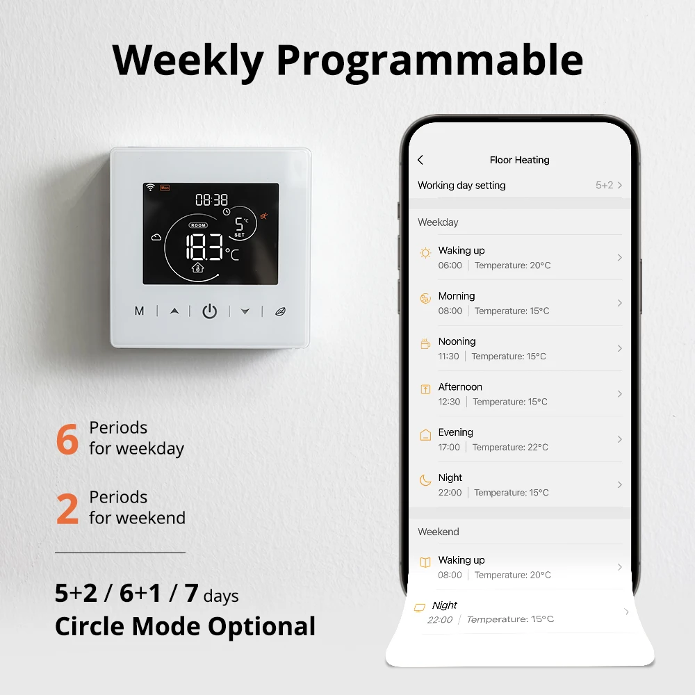 【주간 프로그램 가능 】 5 + 2/6 + 주 1/7 일, 평일 6 시간, 휴식 일 2 시간, 다른 온도 설정을 지원하고 일정에 따라 실행합니다.