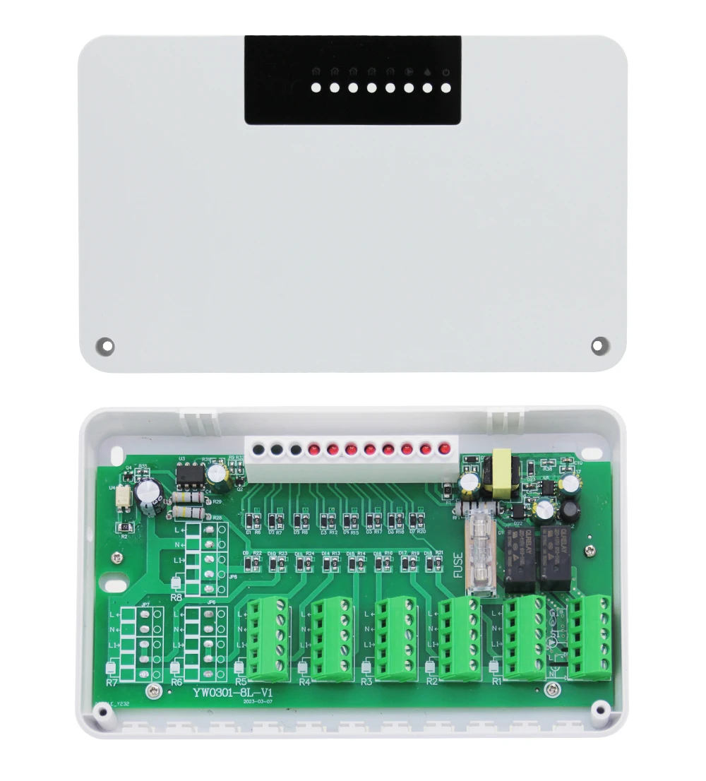 어떤 방을 가열해야 할 때 해당 방의 온도 조절기가이 제품에 신호를 입력하고 해당 액추에이터가 켜지고 표시기가 켜집니다. 온도 조절기에 신호 입력이 없으면 해당 액추에이터가 꺼지고 표시기가 꺼집니다. 모든 서모 스탯에 신호 입력이있는 경우 사전 설정된 지연 시간 후에 워터 펌프 (전원 연결 포함) 및 보일러 (전원 연결 제외) 의 연결 출력이 켜져 있고, 해당 연결 표시기가 켜져 있고 모든 서모 스탯에 신호 입력이 없으면 워터 펌프와 보일러의 연결 출력이 꺼져 있고 해당 연결 표시기가 꺼져 있습니다.